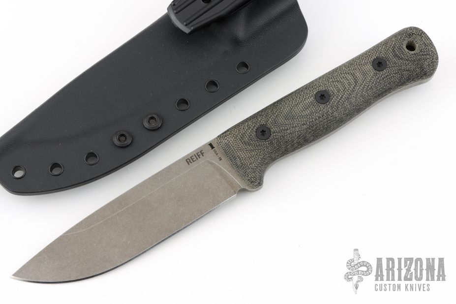 At Reiff Knives we are obsessed with quality and comfort. All of our products are designed to be used heavily. We make tools, not pocket jewelry or safe queens (although they can work well in those capacities,). The F5 is no exception. At 5" long, the full-tang handle balances well with the 5" blade, for a center of mass — or balance point — that rests right around the index finger.  Have you ever gone to a mattress store and, after trying 50 mattresses, finally laid on the one that made you sigh in relief as your tired body melted into its warm embrace? Well, that's the feeling you should expect the first time you pick up your F5. The textured canvas micarta handle scales provide a natural feel and secure grip, even when wet. They are held fast to the tang with three sets of coated stainless steel fasteners.