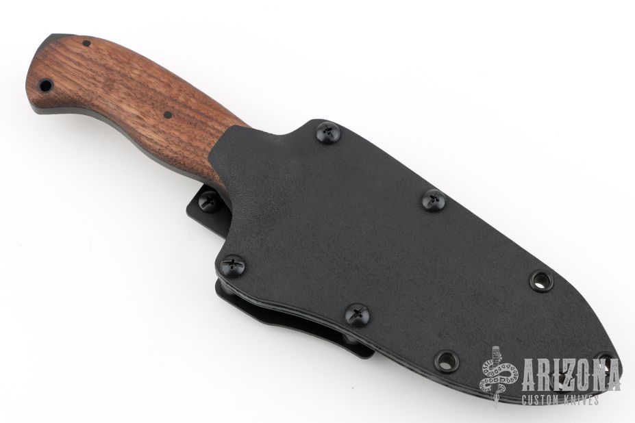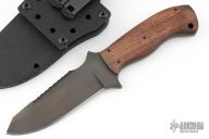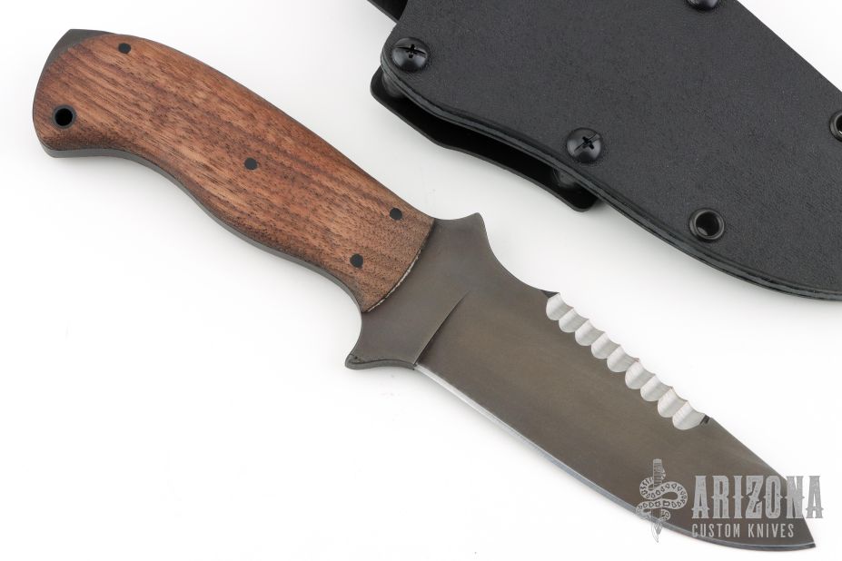 As the name implies, the WK Utility Knife Crusher is made for a variety of cutting chores. The wide blade is strong and the aggressive serration along the spine provides additional cutting/sawing options without sacrificing any of the cutting edge. The double “cross guard” makes heavy work safer for the user. We have added a Crusher Pommel to the back of the Knife to act as a glass breaker or pointed striker. The lined Boltaron® sheath with a 1/8” Black Laminate welt is designed for optimal carry.