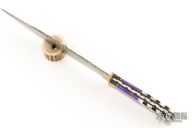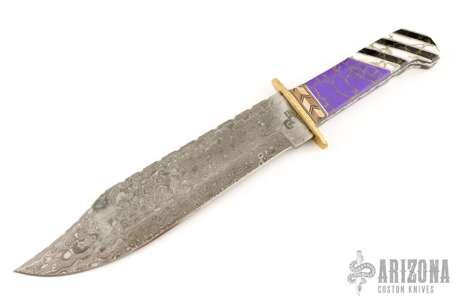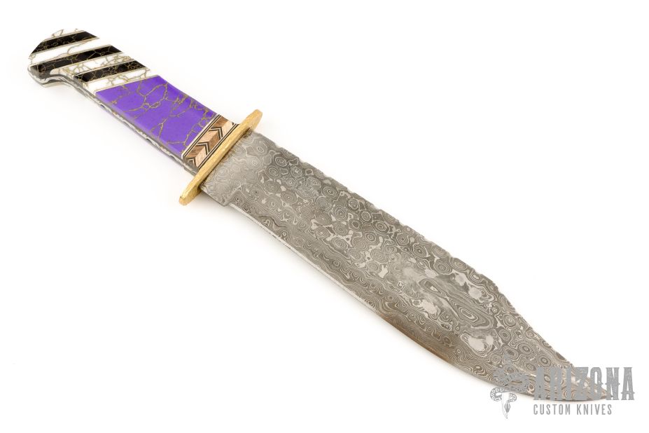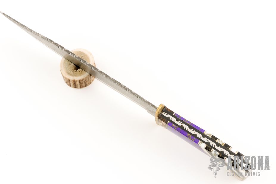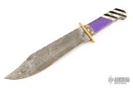 This Bowie by Painted Pony features a Damascus blade with fileworked spine, .156" blade stock and 2.139" blade depth, hidden/frame tang construction. The handle has a textured brass guard, fileworked steel frame, multi-piece scales consisting of mosaic wood spacers behind the guard, purple/gold stone, white/gold stone and black/gold stone with nickel silver spacers, black liners. #7 on the blade. Has a couple light scratches, otherwise excellent condition.