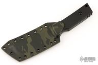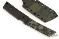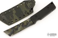 It has a black multi-cam tanto blade, .250" blade stock and 1.283" blade depth, full tang construction. The handle has black G-10 scales. Comes with matching camo kydex sheath.