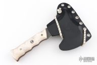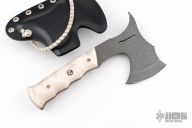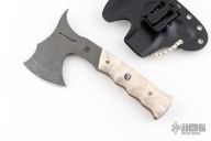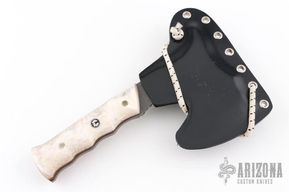 This Hunting Hawk by Semper Sharp LLC features an acid tumbled blade with fileworked spine, .199" blade stock and 3.125" blade depth, full tang construction. The handle has moose antler scales with black and brown canvas micarta liners and mosaic pins. Comes with a kydex sheath. Excellent condition.