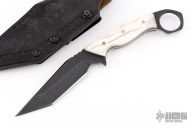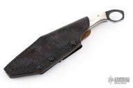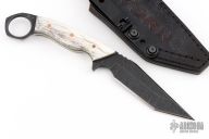 This Tonn by Vorn Knives features an acid etched blade with notched thumbrest and false top edge, .149" blade stock and 1.042" blade depth, full tang construction. The handle has elk antler scales and black G-10 liners. Comes with a brown leather sheath. .925" finger hole. Excellent condition.