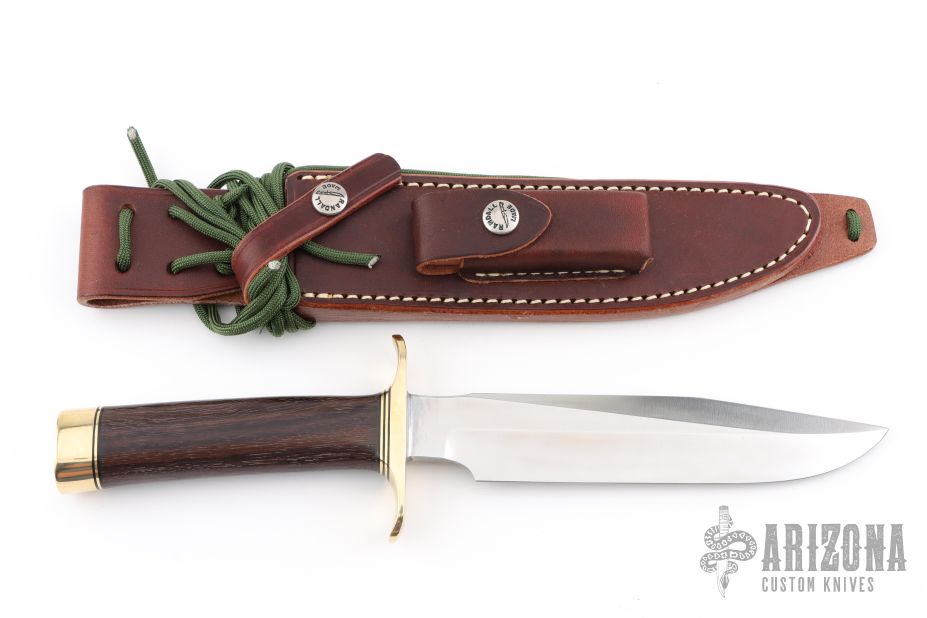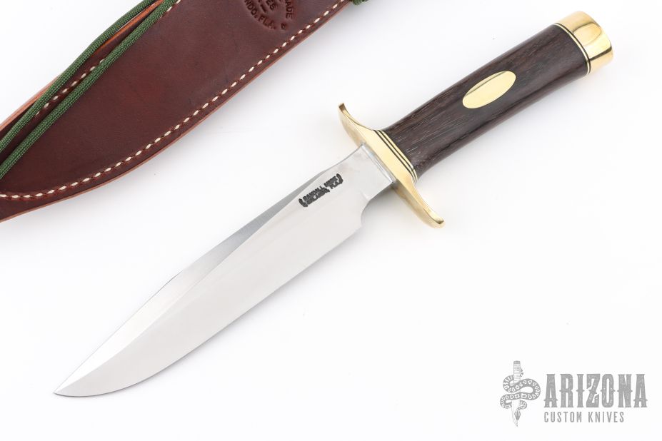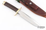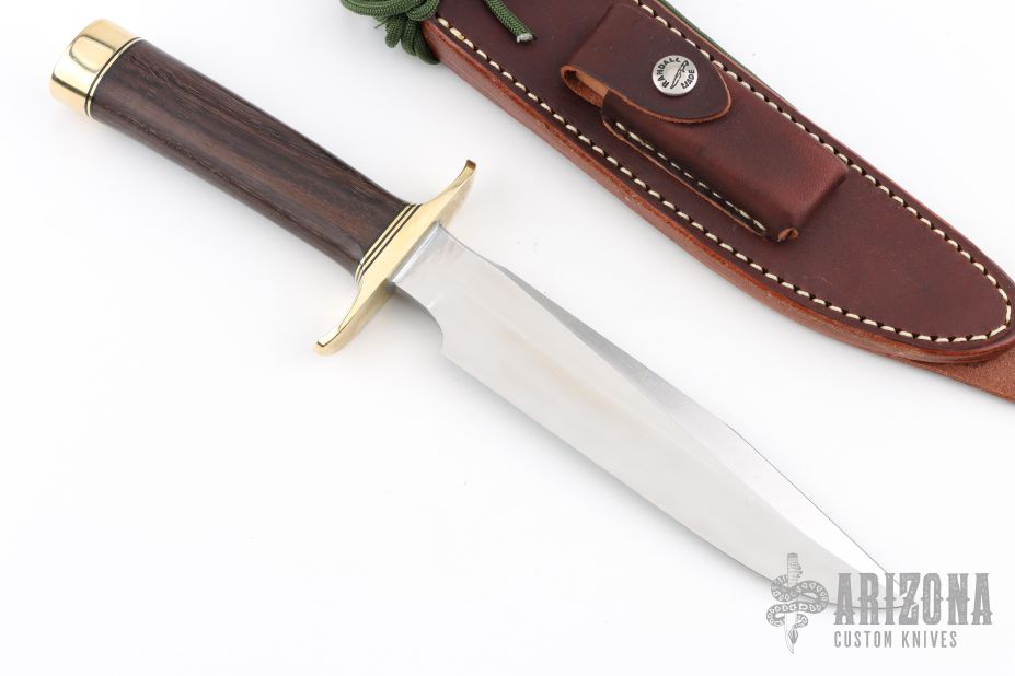 The Model 1 was made famous by Allied combat troops in World War II and has since been widely used in all theaters of war. It has a satin finished blade with sharpened top edge, .220" blade stock and 1.265" blade depth, hidden tang construction. The handle has a brass guard and butt, rosewood grip with brass escutcheon, black/brass spacers. Includes a brown leather sheath and original paper wrapping. New from maker.