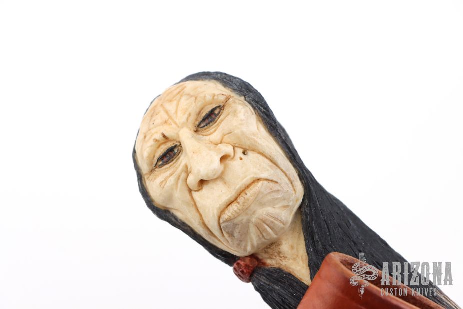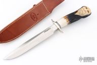 "The Model 1 by Randall Made Knives was made famous by Allied combat troops in World War II and has since been widely used in all theaters of war." This knife features a satin finished blade with a sharpened top edge, .236" blade stock and 1.167" blade depth, hidden tang construction. The handle has a nickel silver guard, crown stag grip with black/duralumin spacers, and a carved face of "Red Cloud" on the butt by Paul G Gussenmeyer. Includes original brown leather sheath (no stone). Excellent condition. Made in 1993