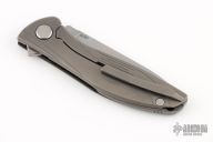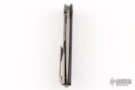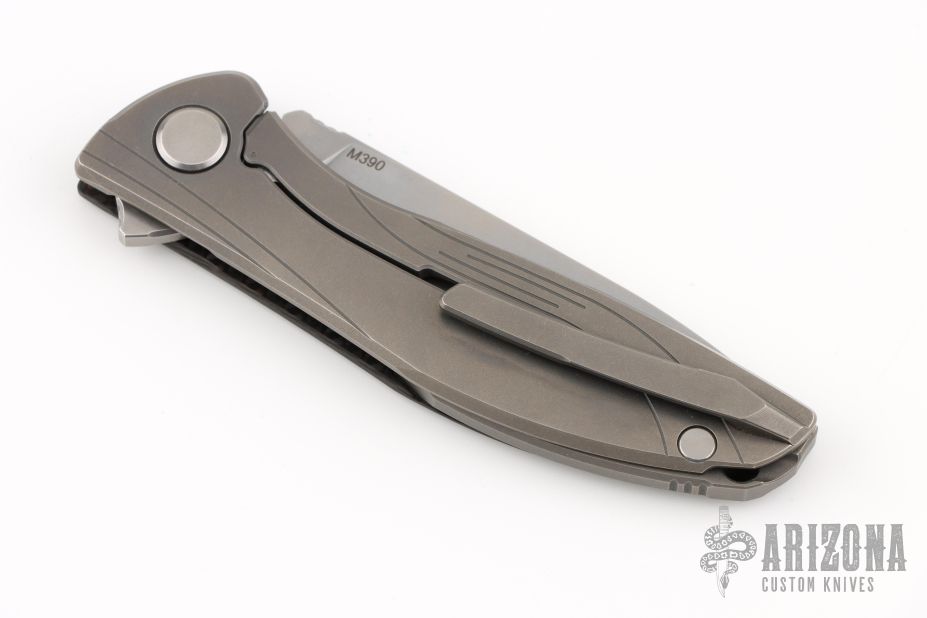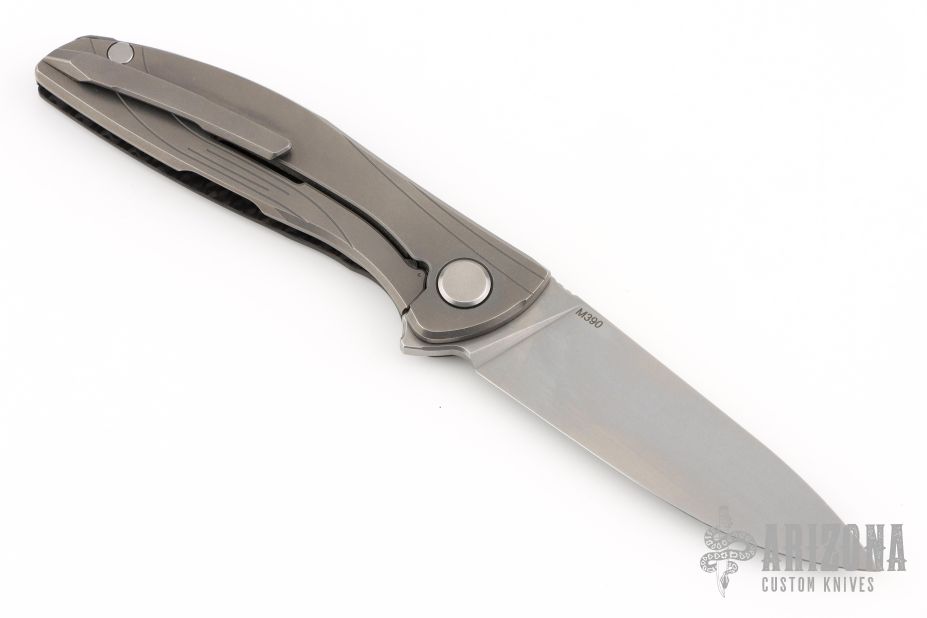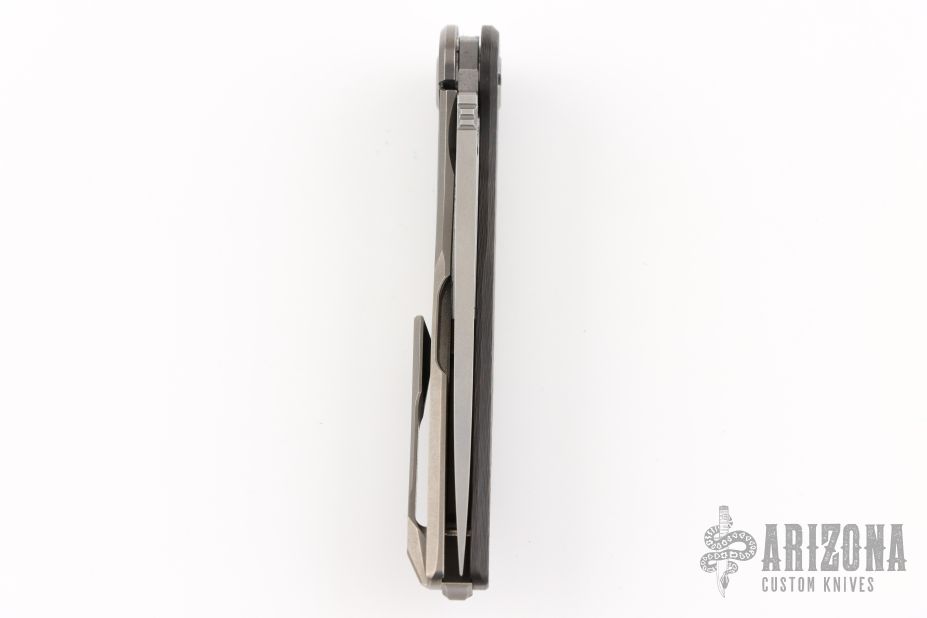 This HatiOn Lite by Shirogorov Knives features a tumble finished drop point blade with flipper. The handle has a Carbon Fiber "A" side and a tumbled titanium lockside over a titanium backspacer with recessed lanyard bail. 3D Machined titanium pocket clip is positioned for right hand, tip up carry. Comes with original box and papers. Excellent condition.