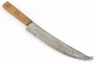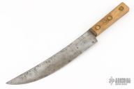 This Foster Bros Knife is made of carbon steel and has .104" blade stock and 1.603" blade depth, full tang construction. The handle has wood scales with brass pins. Has some scratches and oxidation, good condition for its age.