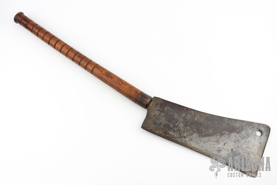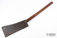 This Hog Splitter by Foster Bros has a cleaver style blade with .430" blade stock and 6" blade depth, hidden tang construction. The handle has a steel ferrule with a ribbed wood grip. Has been used, has patina and some oxidation, has been resharpened, otherwise good condition for its age. Probably from the late 1800s-early 1900s.