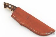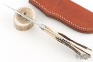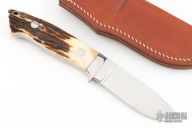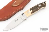This Drop Point Hunter by John Young features a mirror polished blade with .159" blade stock and 1.065" blade depth, full tapered tang construction. The handle has a mirror polished stainless guard, stag scales and red liners. Lanyard hole at butt. Comes with brown leather sheath. Excellent condition.