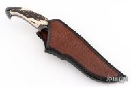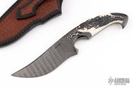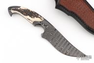 This hunter from the Sobral Brothers, is made from Damascus that has been forged into a beautiful finished product. It has a clip point recurve blade with a false top edge, .347" blade stock and 1.478" blade depth, full tang integral construction. The handle features very nice stag scales. Comes with a hand tooled brown leather sheath, and leather zipper case. New from maker!