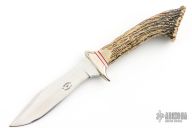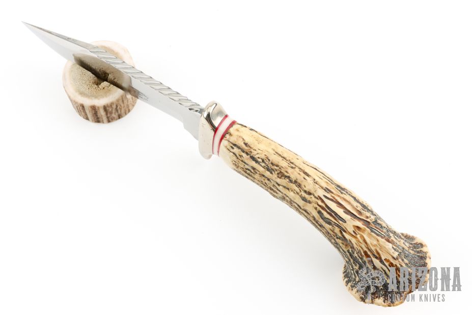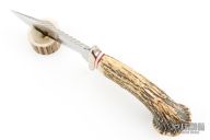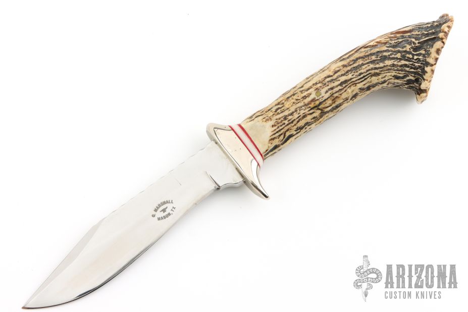 This knife by Glenn Marshall features a mirror polished blade with fileworked spine and a false top edge, .258" blade stock and 1.208" blade depth, hidden tang construction. The handle has a nickel silver guard, crown stag grip, red/white spacers. Comes with a zippered case. Has some light scratches, otherwise excellent condition for its age.