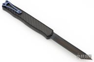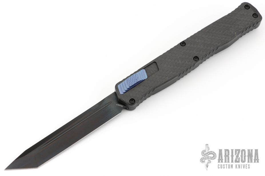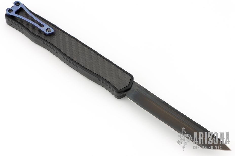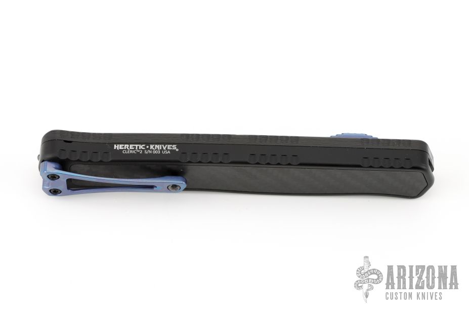 This Cleric II OTF by Heretic Knives features a DLC stonewashed tanto Magnacut blade with false top edge and fullers. The handle has a black aluminum frame with carbon fiber inlays, blue titanium accents and tip down clip with ceramic ball. Comes with box, lube and papers. Excellent condition.