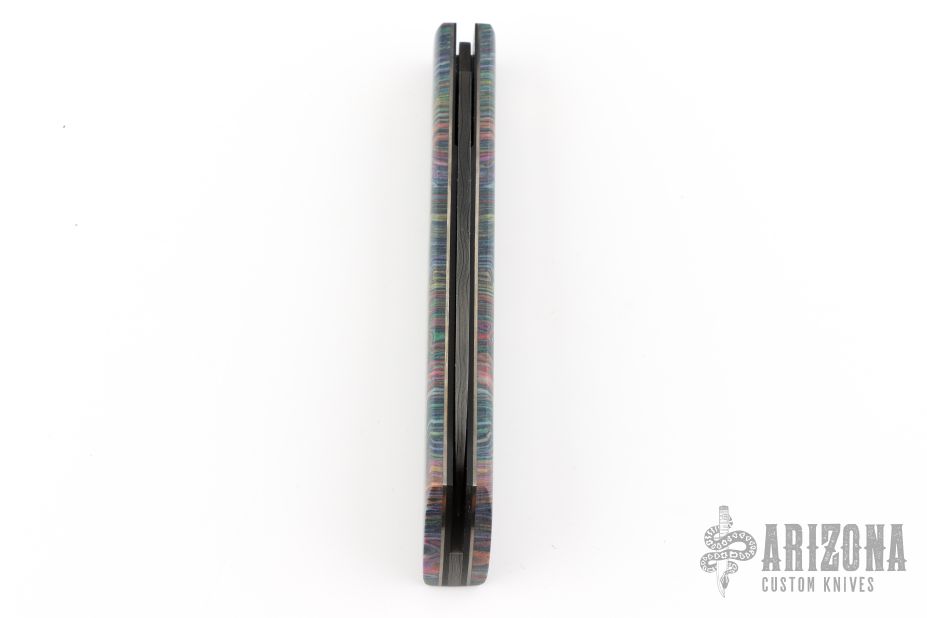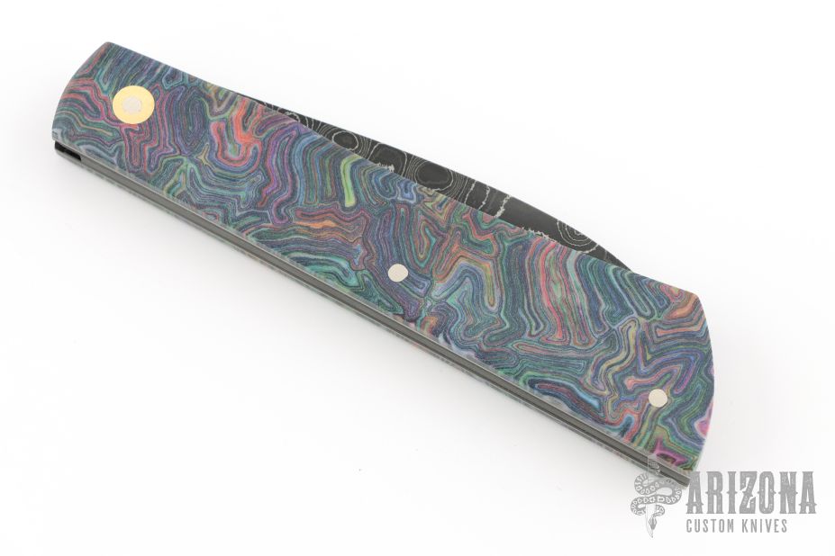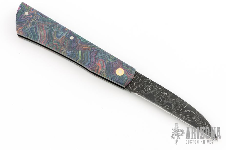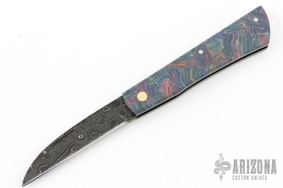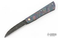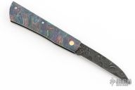 This Slipjoint Trapper by Brett Gwin features an Alabama Damascus blade with nail nick. The handle has crazy micarta covers with stainless steel and black G-10 liners, matching Damascus spring. Has half-stop, flush in all positions. New from maker.