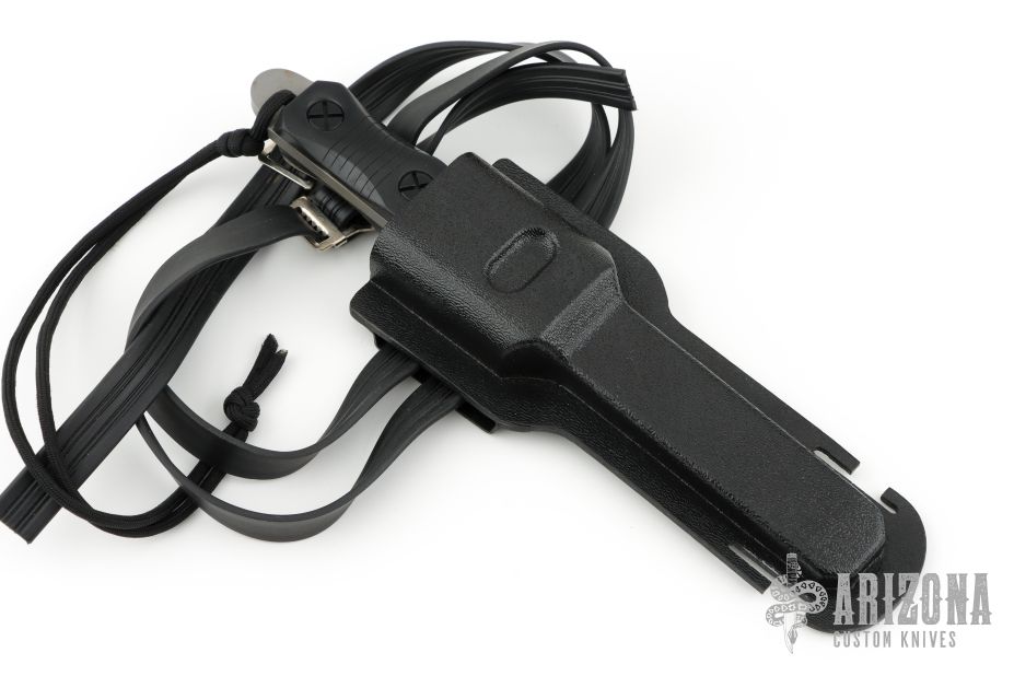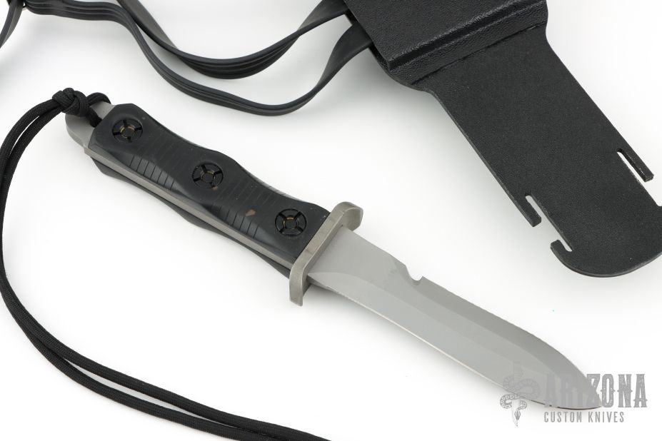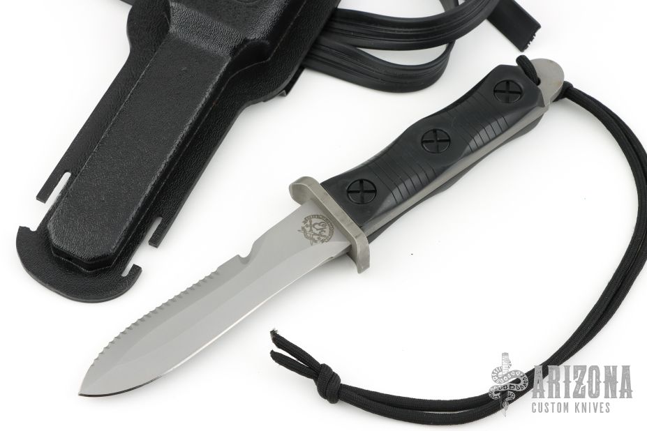 This Dive Knife by EK Knives features a bead blasted blade with serrated top edge, .236" blade stock and 1.059" blade depth, full tang construction. The handle has a stainless steel guard with rubber scales. Comes with a black kydex sheath. Has a few scuffs, otherwise excellent condition. Rare.