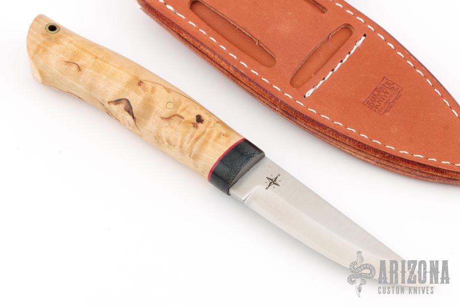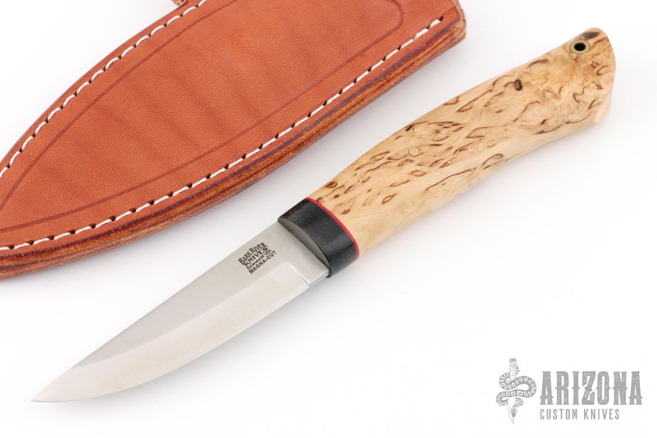 This Forest Scandi fixed blade from Bark River Knives features a satin finish drop point blade with 0.142" blade stock and .946" blade depth. The handle is comprised of Black Canvas Bolster & Masur Birch with red liner. Lanyard hole on pommel. Includes a brown leather sheath and original box. Excellent condition.