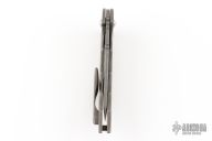 This Homicide #75 by Jeff VanderMeulen has a dark stonewashed multi-ground blade with notched thumbrest and flipper.  The handle has a stonewash finished titanium frame and tip up clip with hidden screws. Comes with a zippered case and COA. Has scuffs and scratches, great condition otherwise.
