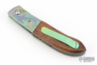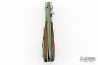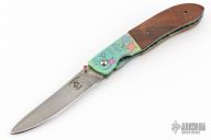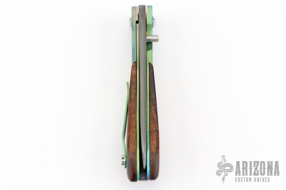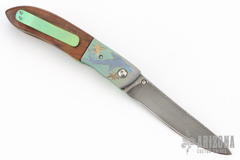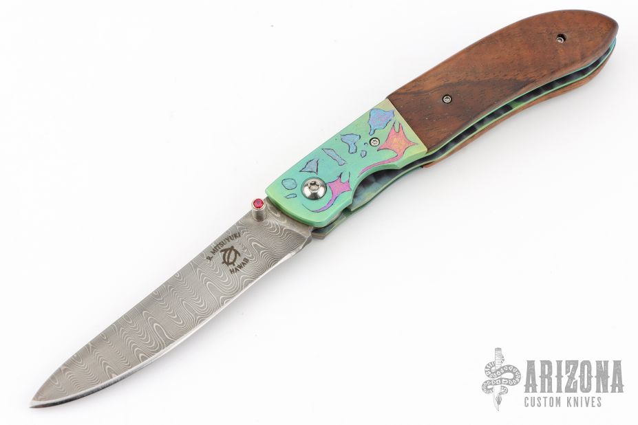 This Linerlock by Ross K Mitsuyuki features a Devin Thomas Damascus blade with a thumbstud with a red stone inlay. The handle has anodized and engraved dovetailed titanium bolsters, Hawaiian Curly Koa scales, anodized titanium liners, tip up anodized titanium clip and black G-10 backspacer. Nice detent and lockup. New from maker. Comes with a hand written COA and a Nylon belt sheath.