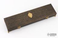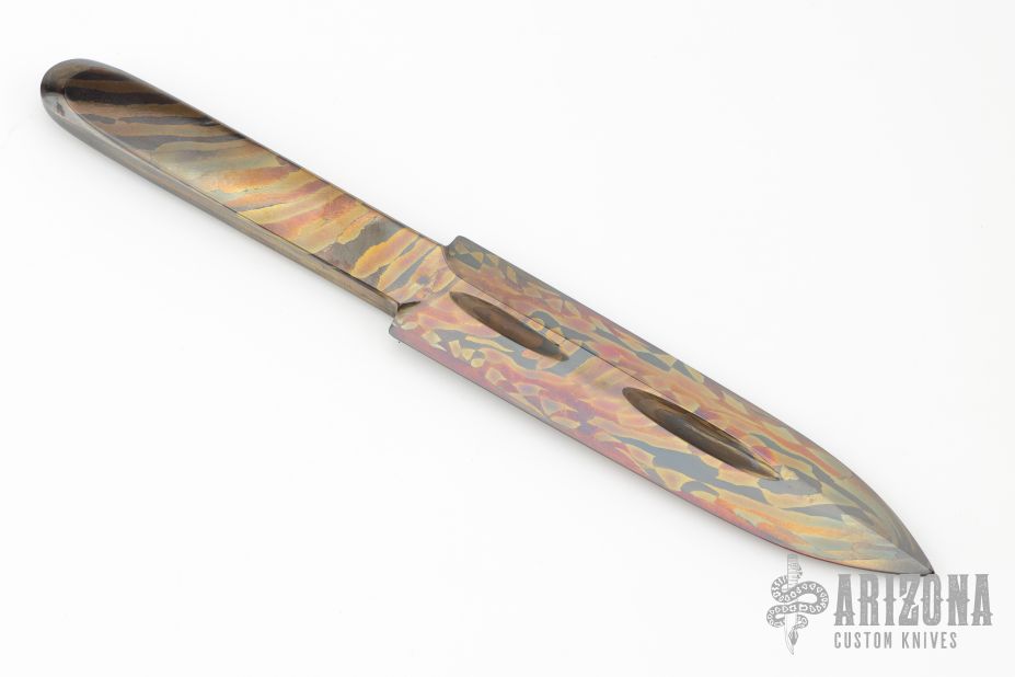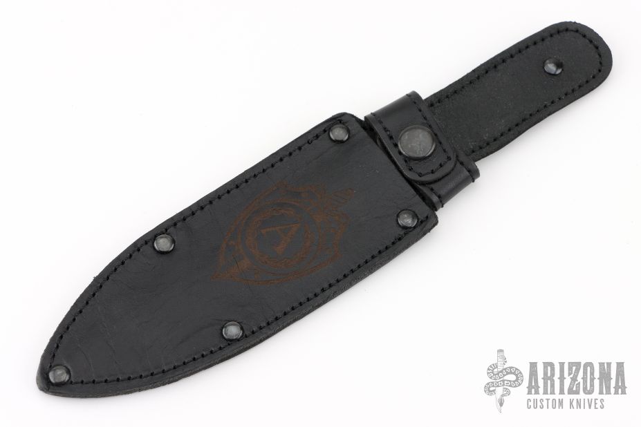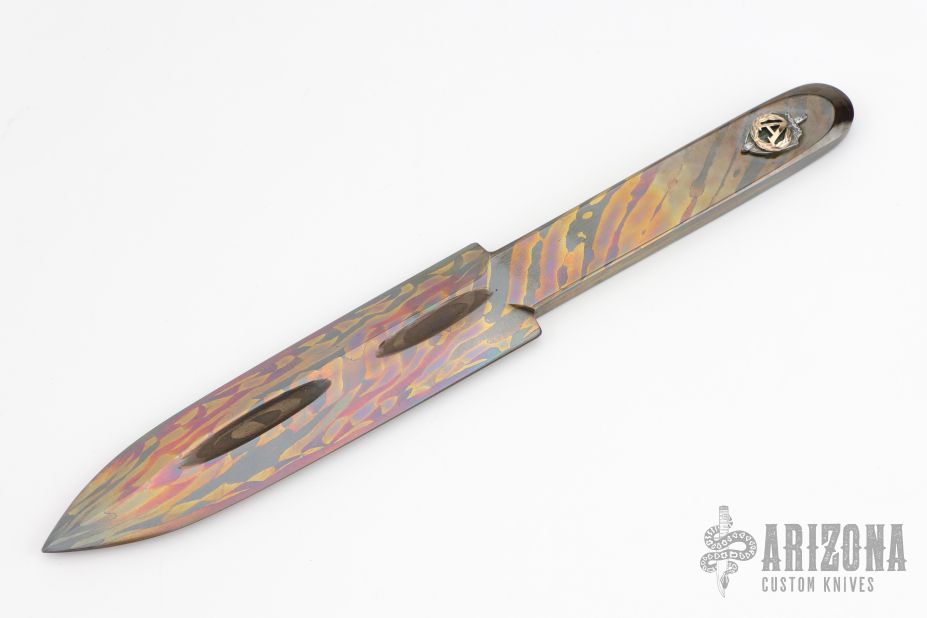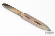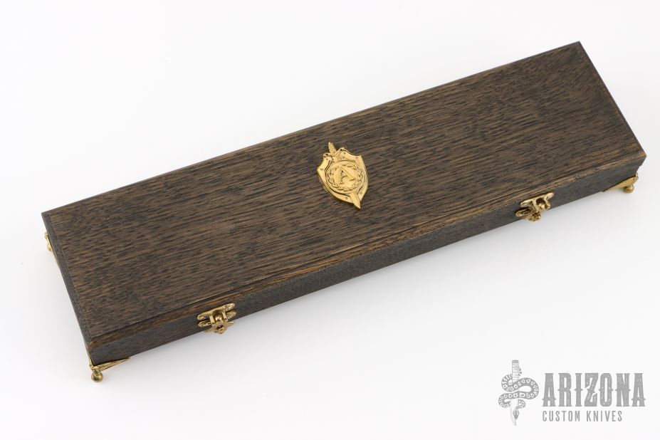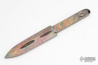 This dagger by Makurin Evgeny Ivanovich features a colored Damascus blade with fullers, .316" blade stock and 1.276" blade depth, full tang construction with an "A" overlay on the butt of the handle. Comes with original wooden presentation box, black leather sheath and COA. Excellent condition.