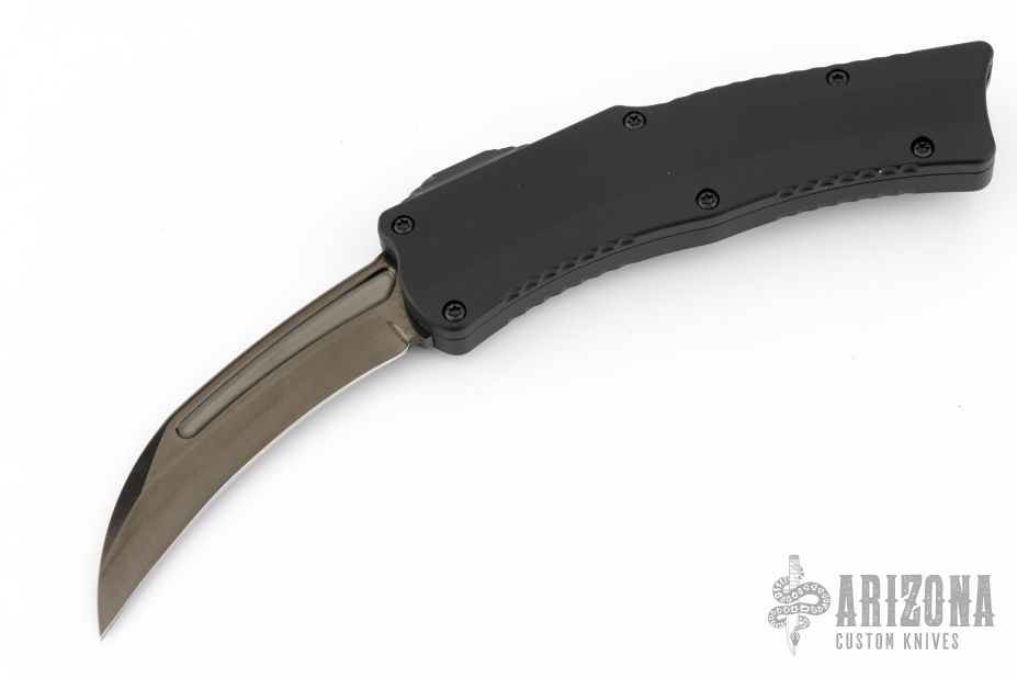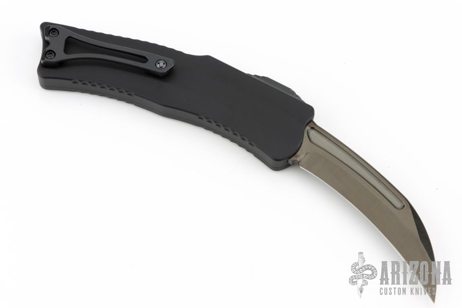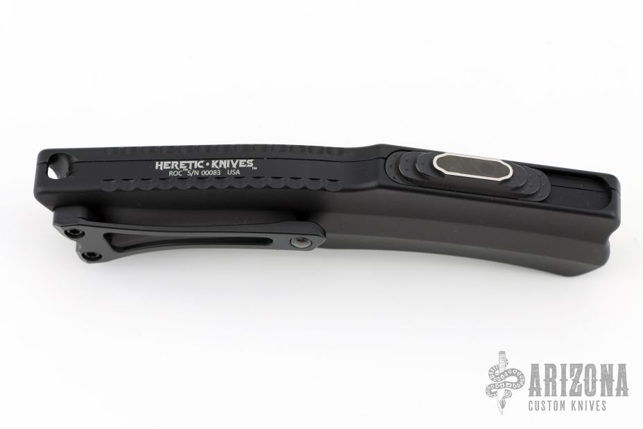 This Custom ROC by Heretic Knives features a hand ground DLC coated blade with fullers and notched thumbrest. The handle has a black aluminum chasis with a tip down DLC titanium clip with ceramic ball. Fat Carbon Black Dunes inlay in the push button. Comes with original box, lube, drawstring pouch and card. #083. Excellent condition.