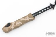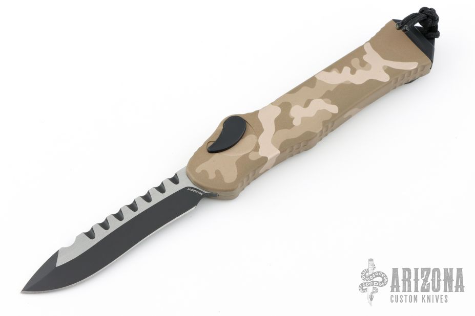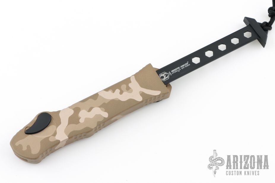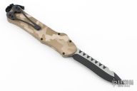 This Hydra by Heretic Knives features a two-tone recurve blade. The handle has a tan camo aluminum frame, black stainless clip. Includes the original box. Includes the original box. Excellent Condition.