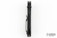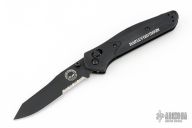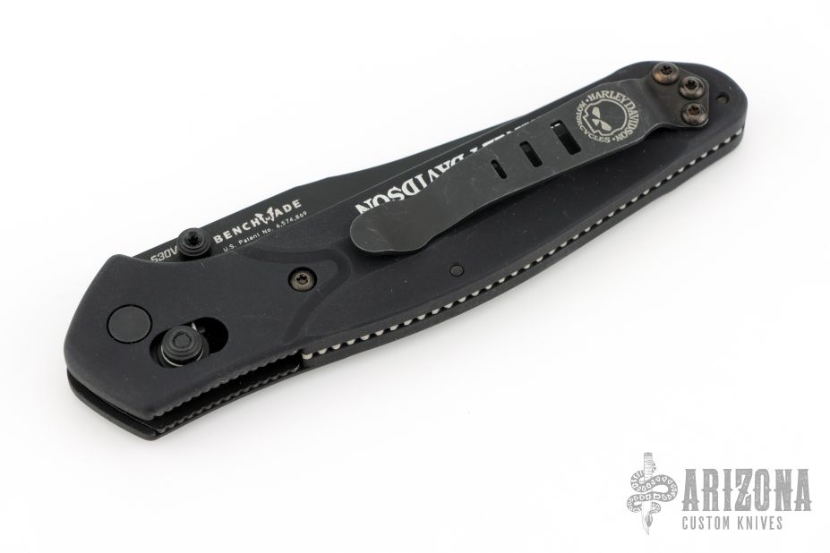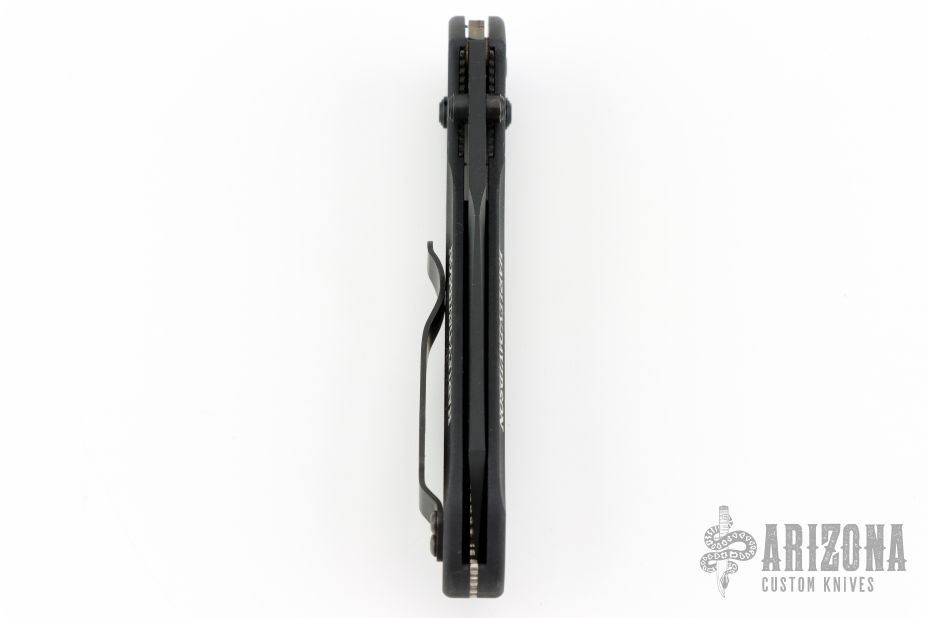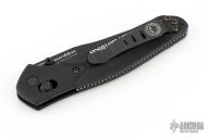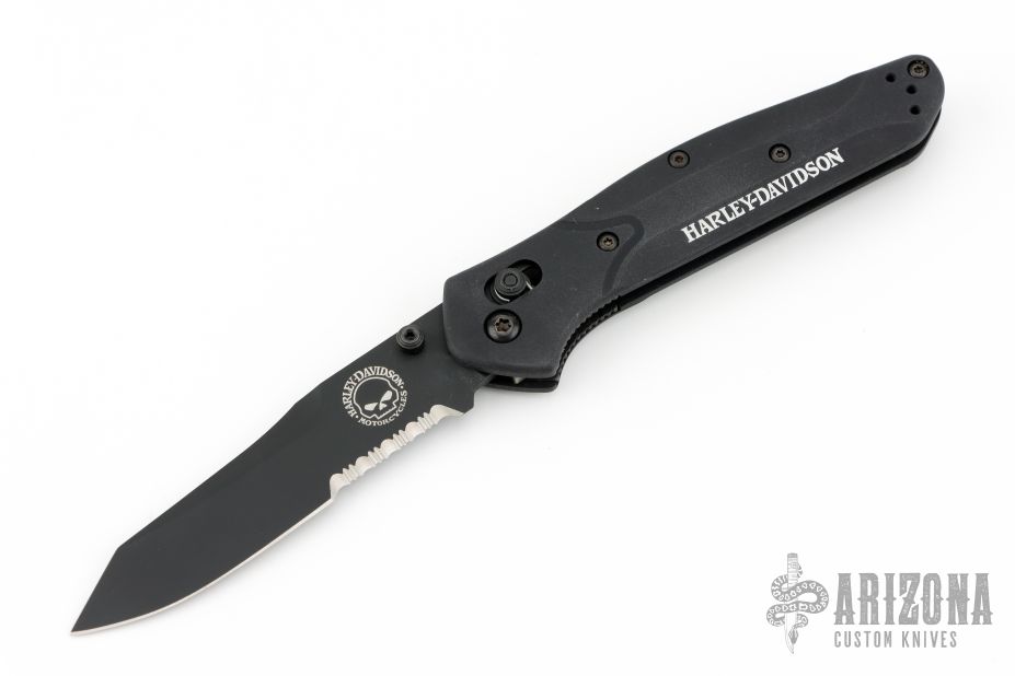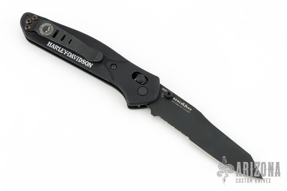 This Benchmade Osborne 940 features a black serrated clip point blade with swedge and dual thumb studs. The handle is comprised of a machined black anodized aluminum frame over jimped titanium backspacer. The black coated, steel tip up clip is reversible for right or left hand carry. Has some scuffs and scratches, excellent condition.