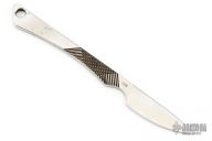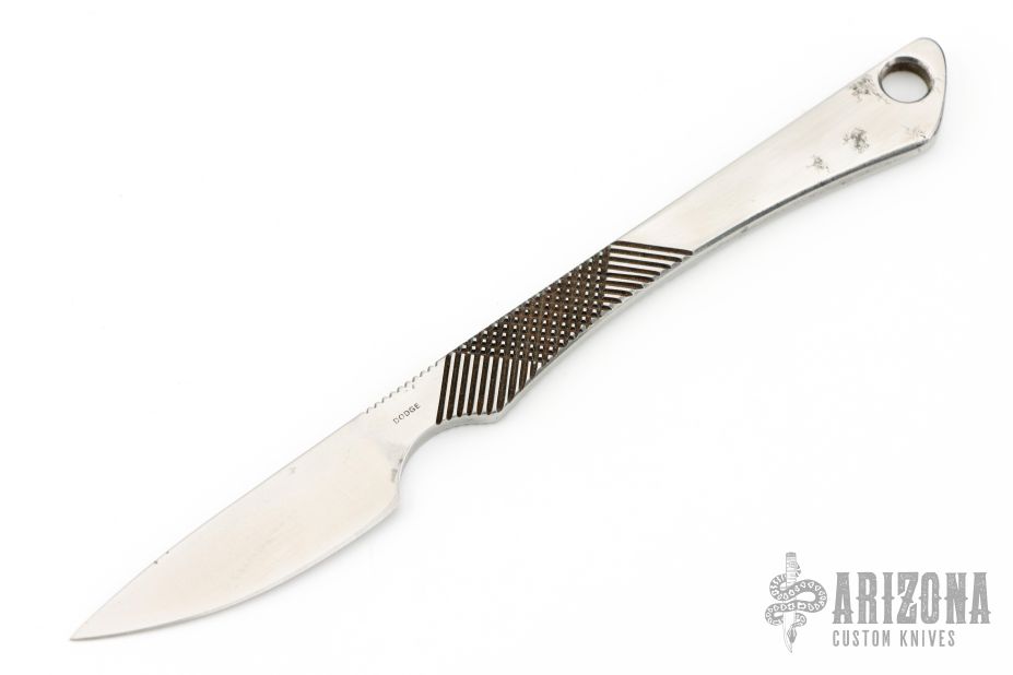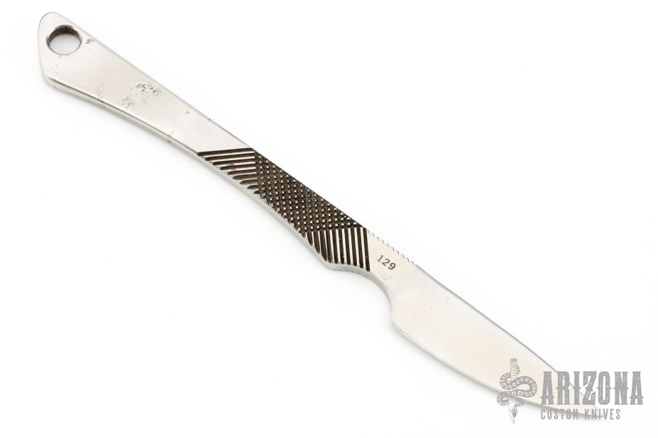 This Caper by Bob Dodge features a satin finished blade and handle, .142" blade stock and .536" blade depth, full tang construction. The handle has been checkered and has a notched thumbrest. #129 on the ricasso. Has some pitting/oxidation on the butt of the handle, otherwise good condition.