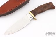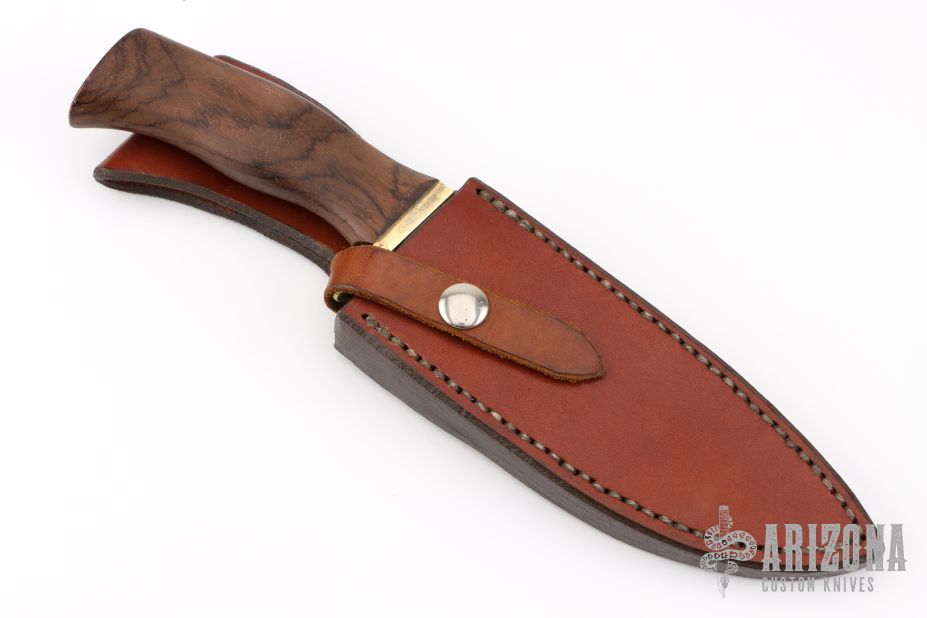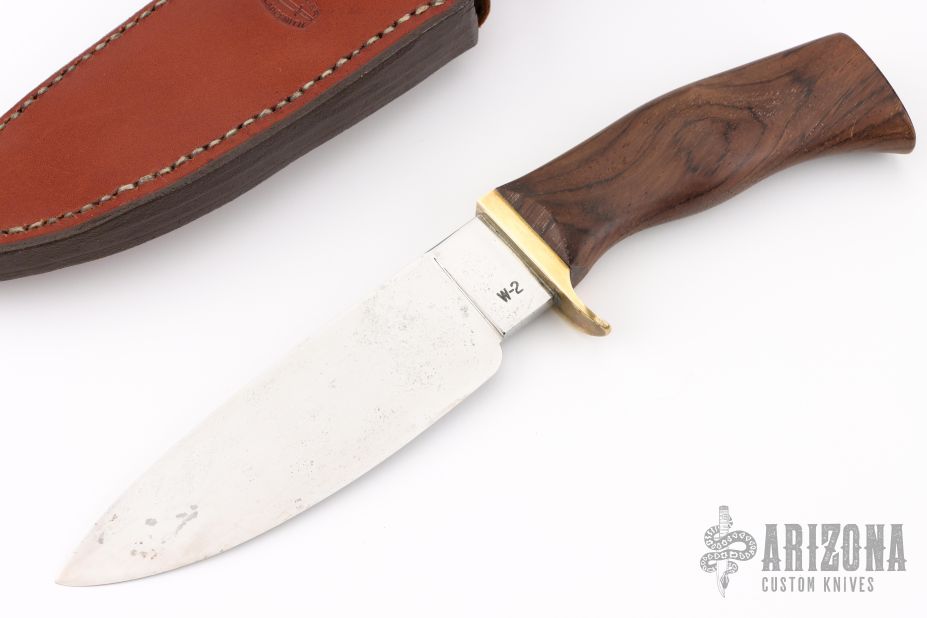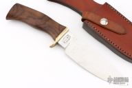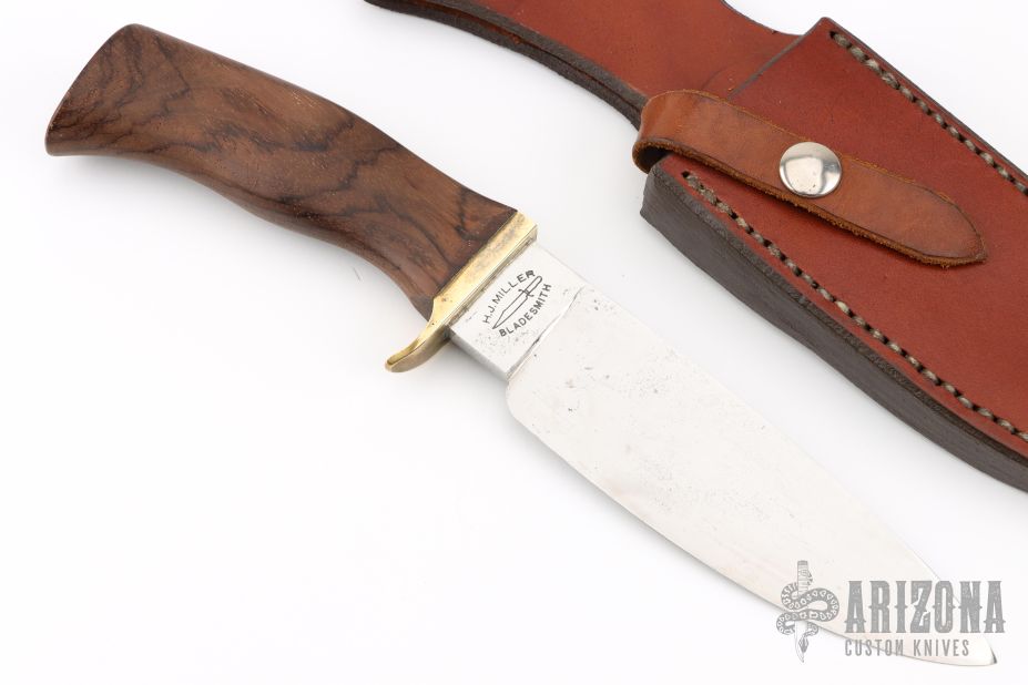 This knife by Master Smith Hanford Miller features a hand forged mirror polished drop point blade with .256" blade stock and 1.556" blade depth, hidden tang construction. The handle has a brass guard and a walnut grip. Comes with a brown leather sheath. Has some patina and light scratches on the blade, otherwise good condition. Comes with a zippered case.