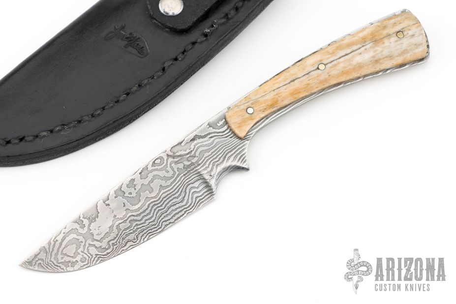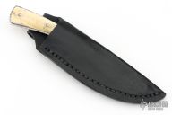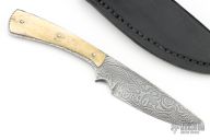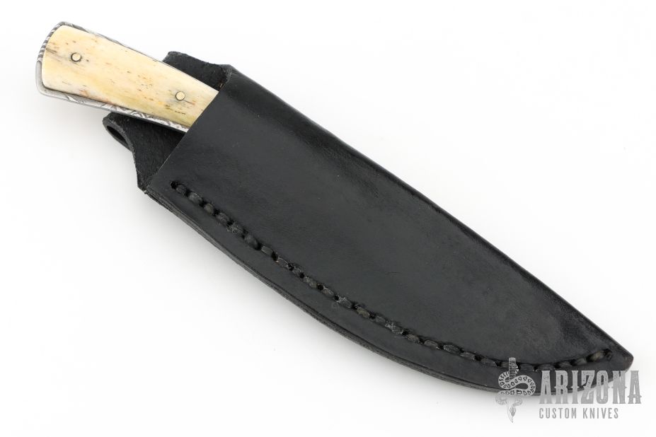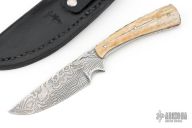 This knife by Jon Moore features a drop point Damascus blade with .120" blade stock and .995" blade depth, full tang construction. The handle has finger choil, and pinned bone covers. Comes with a black leather sheath. Excellent condition.