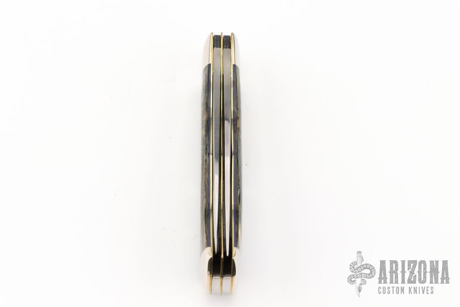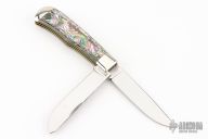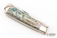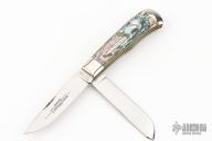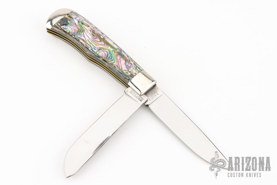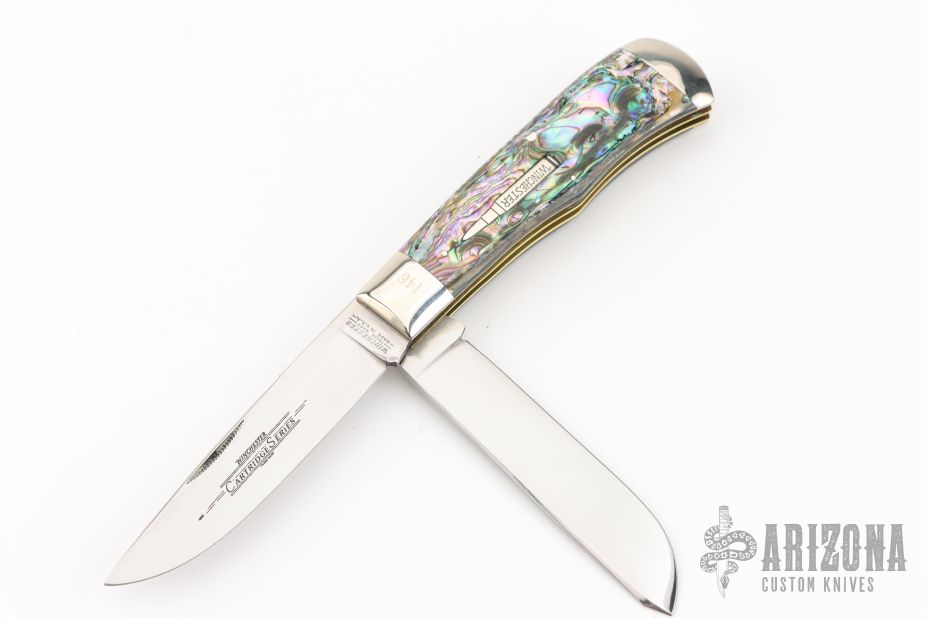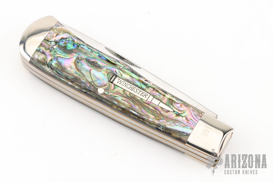 This Winchester folder features two mirror polished blades. Nickel Silver front and rear bolsters with abalone covers. Brass liners and steel spring. Comes with original box and papers. Excellent condition. #146.