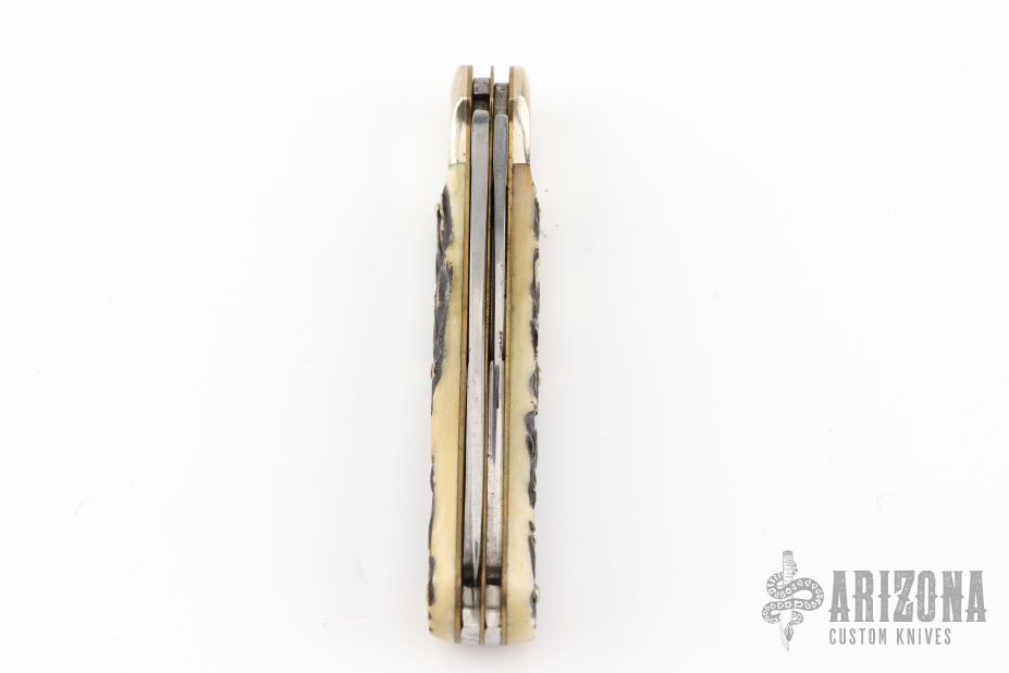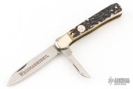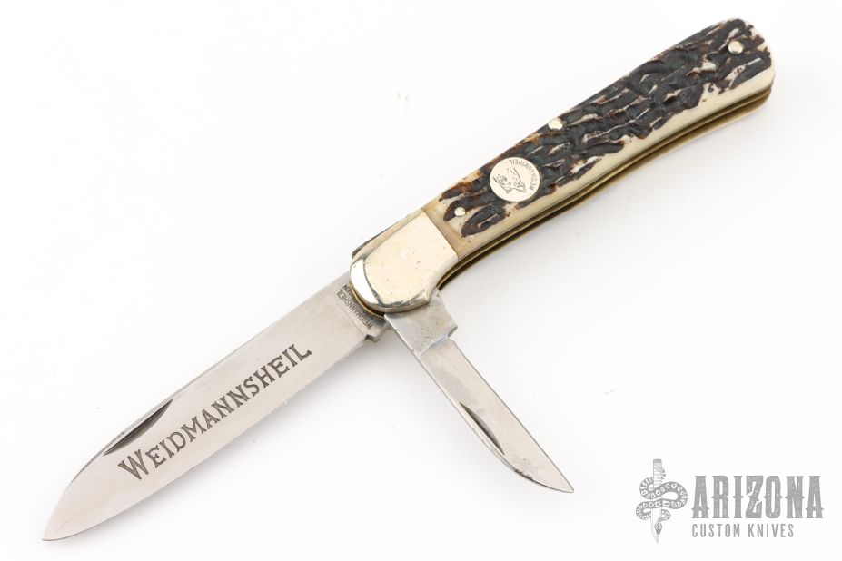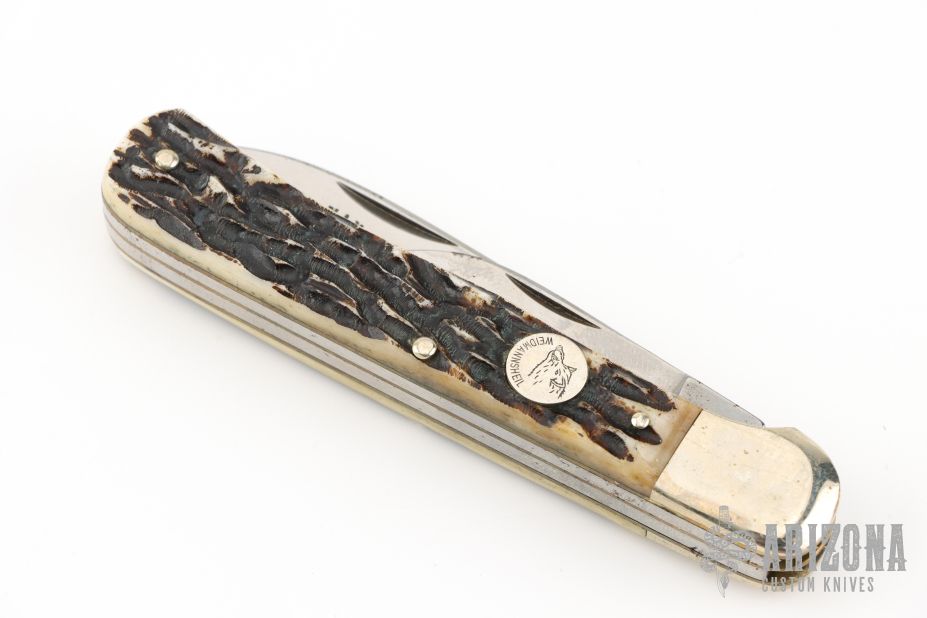 This knife by Weidmannsheil features polished blades with nail nicks. The handle has nickel silver bolsters, jigged bone covers, brass liners and steel springs. Has some light scratches, otherwise excellent condition. The main blade locks open, push down on the small blade to close.