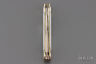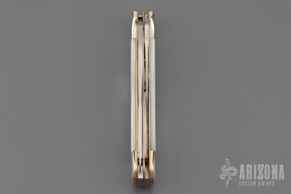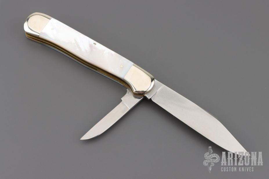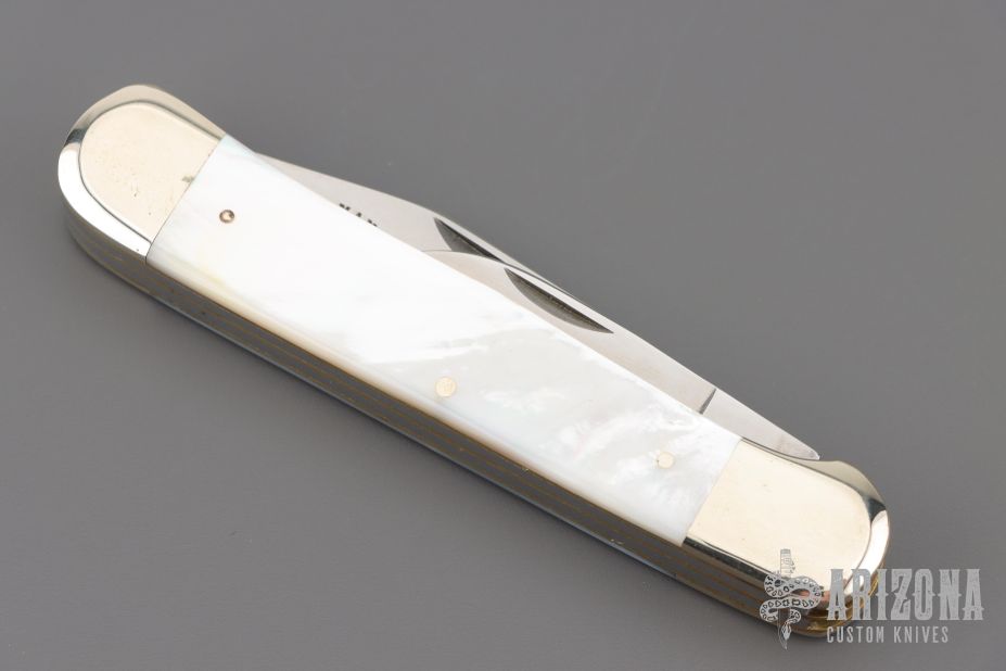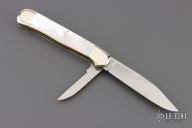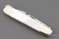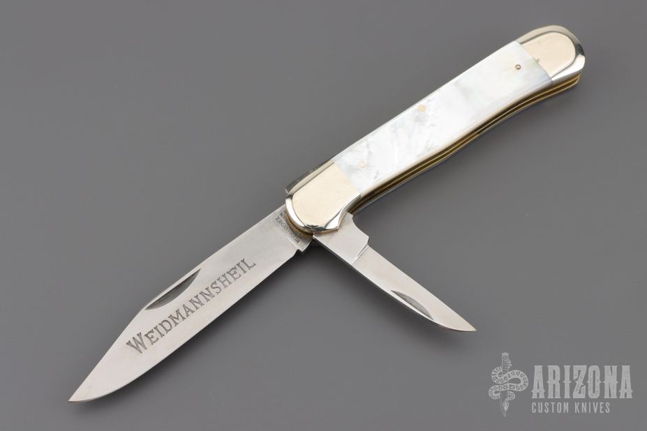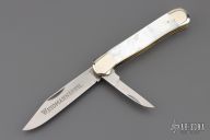 This knife by Weidmannsheil features polished blades with nail nicks. The handle has nickel silver bolsters, mother of pearl covers, brass liners and steel springs. Has some light scratches, otherwise excellent condition. The main blade locks open, push down on the small blade to close.