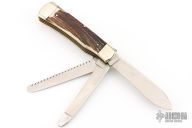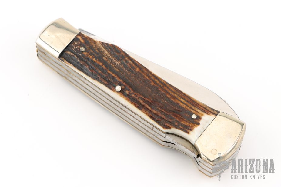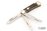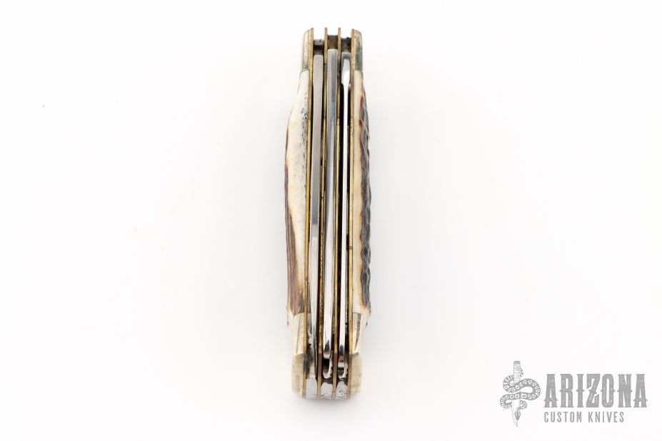 This knife by Weidmannsheil features tumble polished blades with nail nicks. The handle has nickel silver bolsters, stag covers, brass liners and steel springs. Has a few light scratches, otherwise excellent condition.