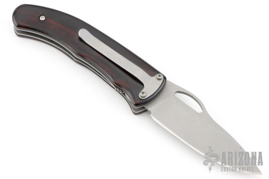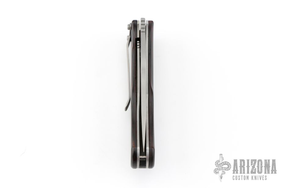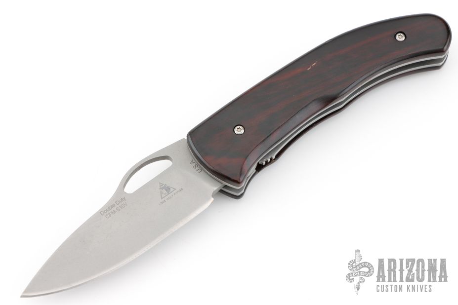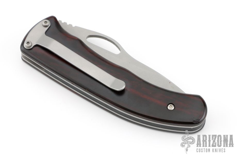 The Double-Duty automatic is a double-action automatic that can function as a one handed opening locking-liner knife or be instantly fired in the automatic mode. The automatic firing mechanism is hidden under the handle and is activated by sliding the front side handle scale towards the back of the knife. Because there are no apparent buttons on the outside of the handle the fact that this is an automatic is known only to its owner. The liners, pocket clip and internal components are stainless steel. The handle is cocobolo. The knife is lightning fast, good looking and comfortable in the hand. Has a couple light scuffs, and patina. Great condition otherwise.