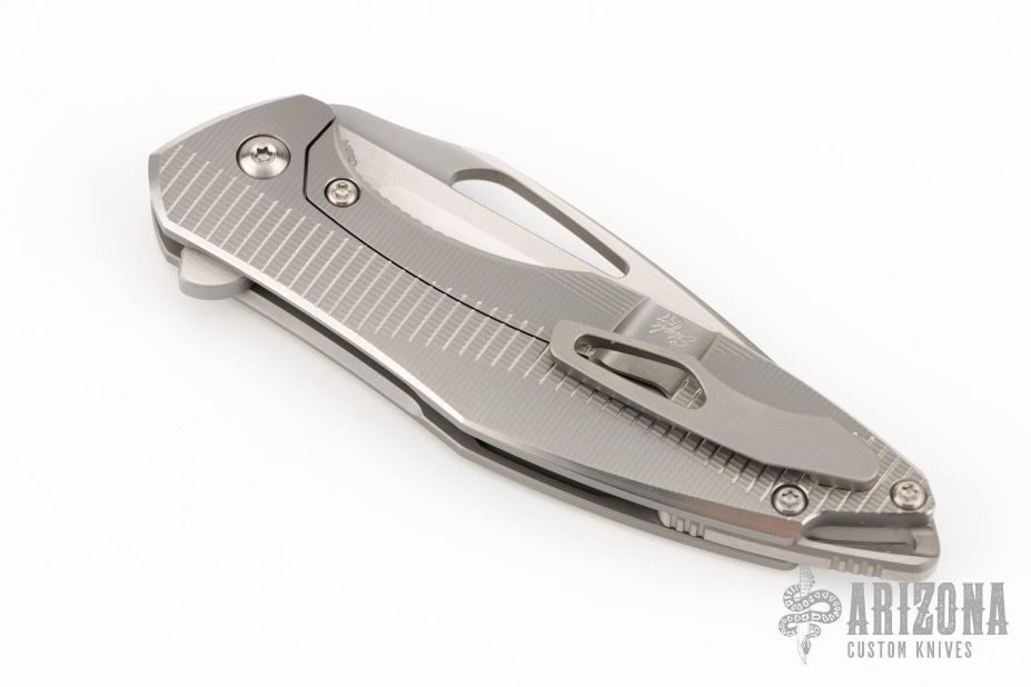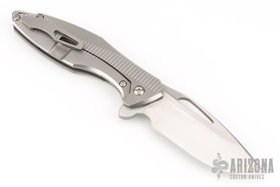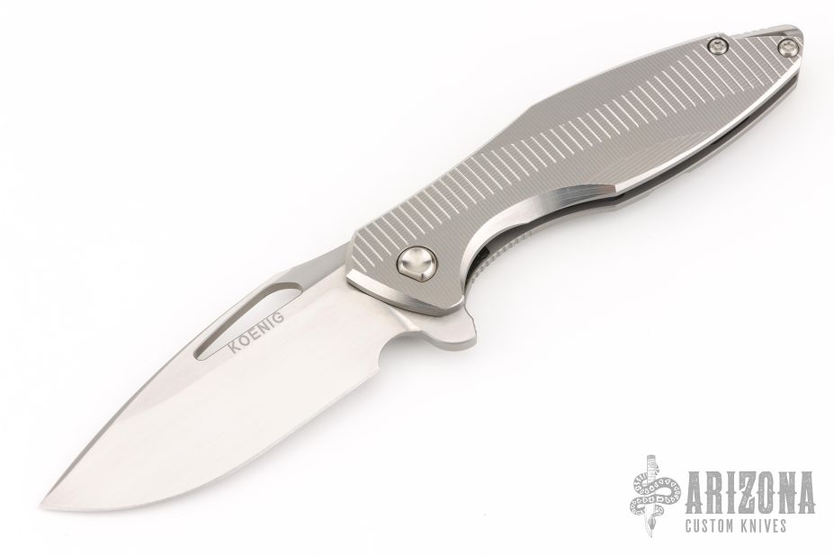 This Mini Arius by Koenig knives features a hand rub satin finished blade with thumbhole and flipper. The handle has a Style 57 titanium frame with a titanium tip up clip, titanium backspacer. Has ceramic bearings and a ceramic detent ball. Nice detent, lockup and blade seating. Comes with original box and COA November 27, 2024. Excellent condition.