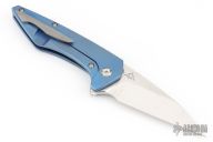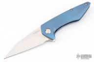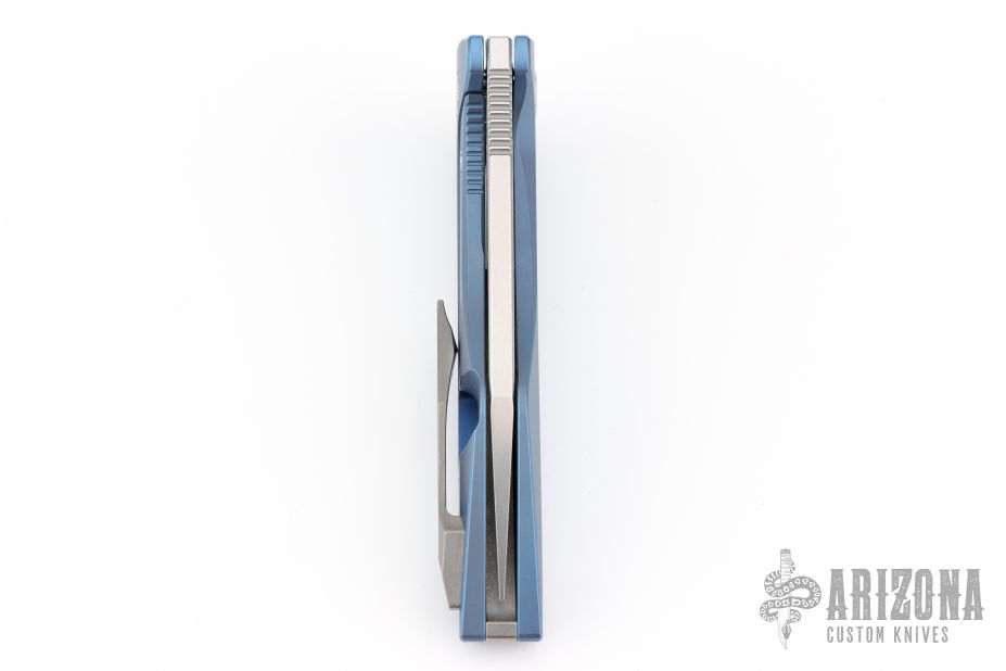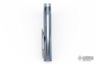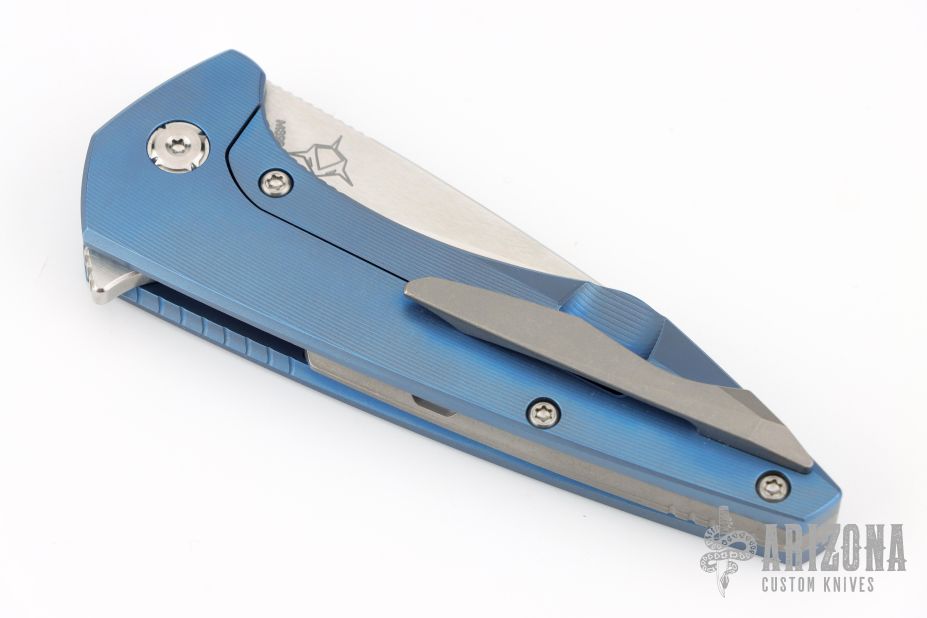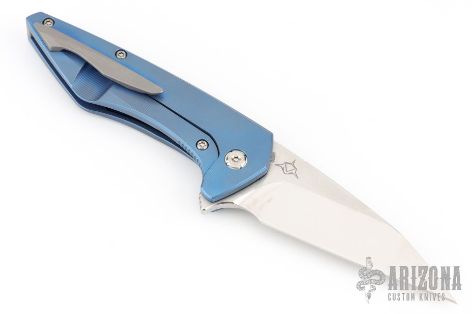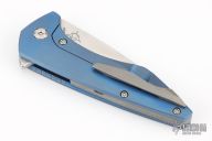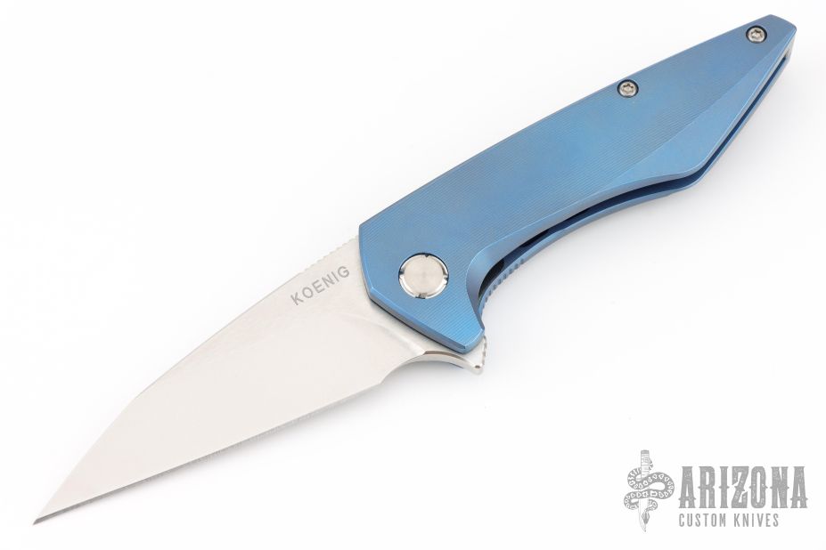 The Koenig Mini-Goblin 3 inch folding pocket knife is a collaboration between Edison Barajas of Sharknivco and Koenig Knives. The Mini-Goblin features a 3 inch brightwashed with PF finished blade with notched thumbrest and flipper. The handle has a milled and anodized titanium frame with a stonewashed titanium backspacer and tip up clip with hidden screws. Comes with original box and card dated 2-24-25. Excellent condition.