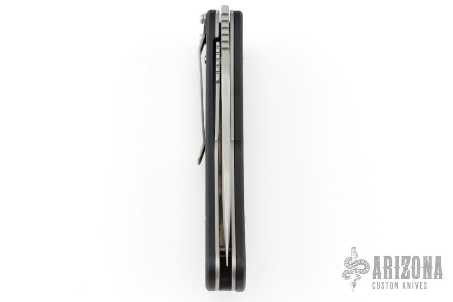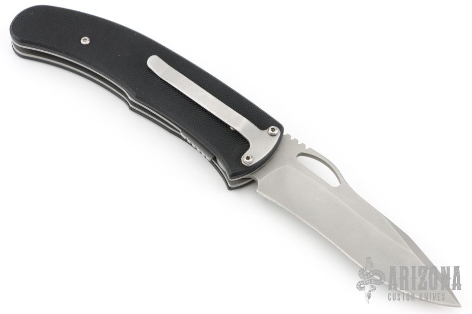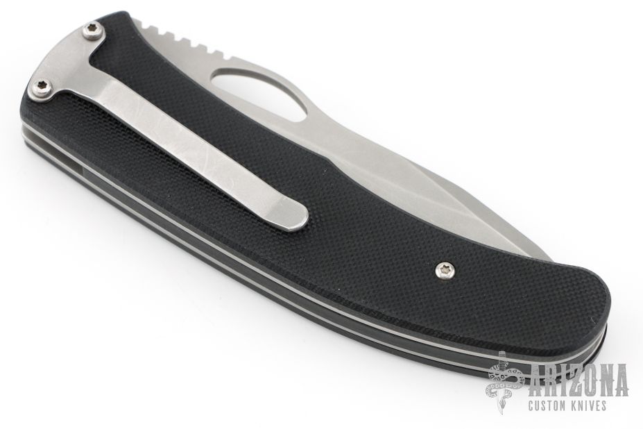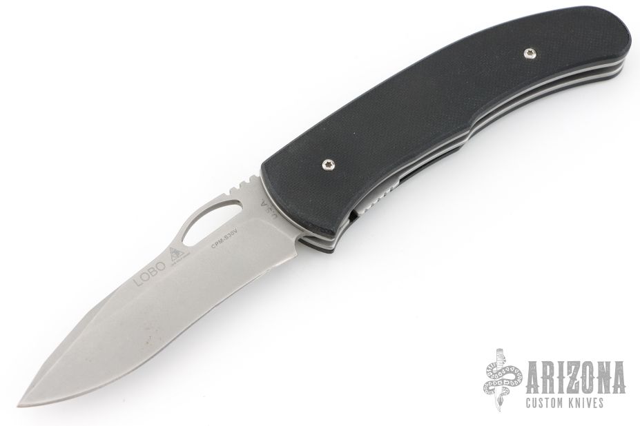 "The new Lobo automatic is a double-action automatic knife that can function as a one handed opening locking-liner knife or be instantly fired in the automatic mode. The Lobo has a 3.5 inch blade to handle any cutting chore and a convenient stainless steel pocket clip. The automatic firing mechanism is hidden under the handle and is activated by sliding the left side handle scale towards the top of the knife. Because there are no apparent buttons on the outside of the handle the fact that the Lobo is an automatic is known only to its owner. This makes the Lobo convenient to carry and use anywhere." This Lobo features a bead blasted blade and black G-10 handle. Has some scuffs and scratches, couple spots on the blade, otherwise great condition.