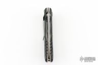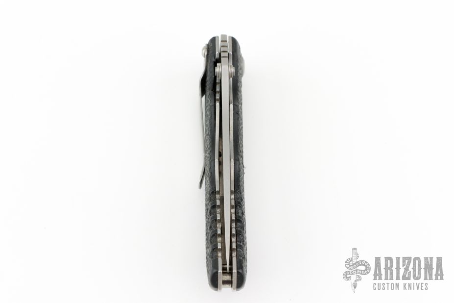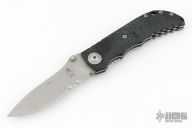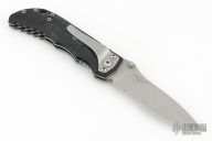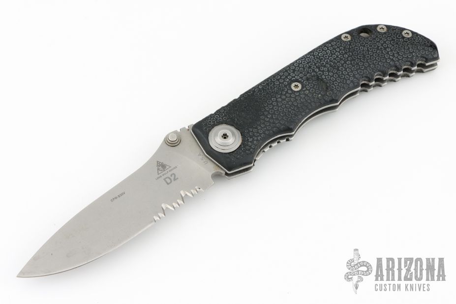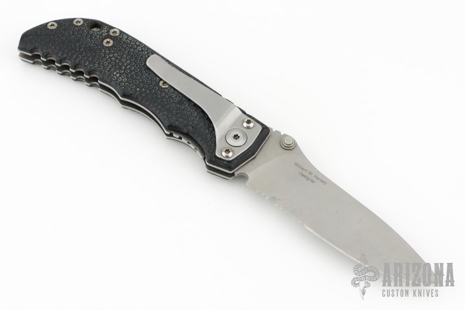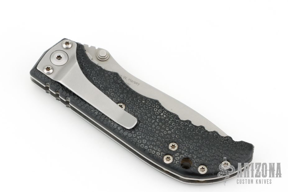 This D2 Harsey Linerlock D/A has a bead blasted, flat ground CPM-S30V spear point blade, dual thumb studs and notched thumbrest. Handle is non-slip polymer over stainless steel liners, lanyard hole, and bead blasted stainless steel tip down clip. Very comfortable knife in the hand. Hard to find piece. It has a hidden button under the scale. Has scuffs and scratches, great condition otherwise.
