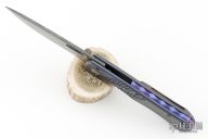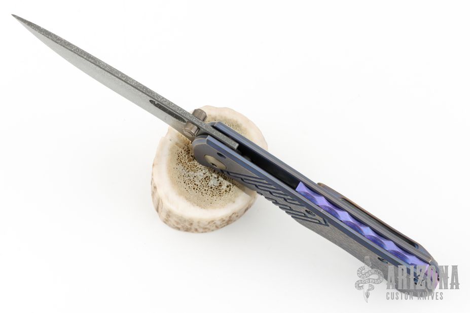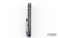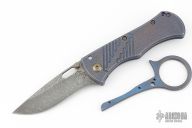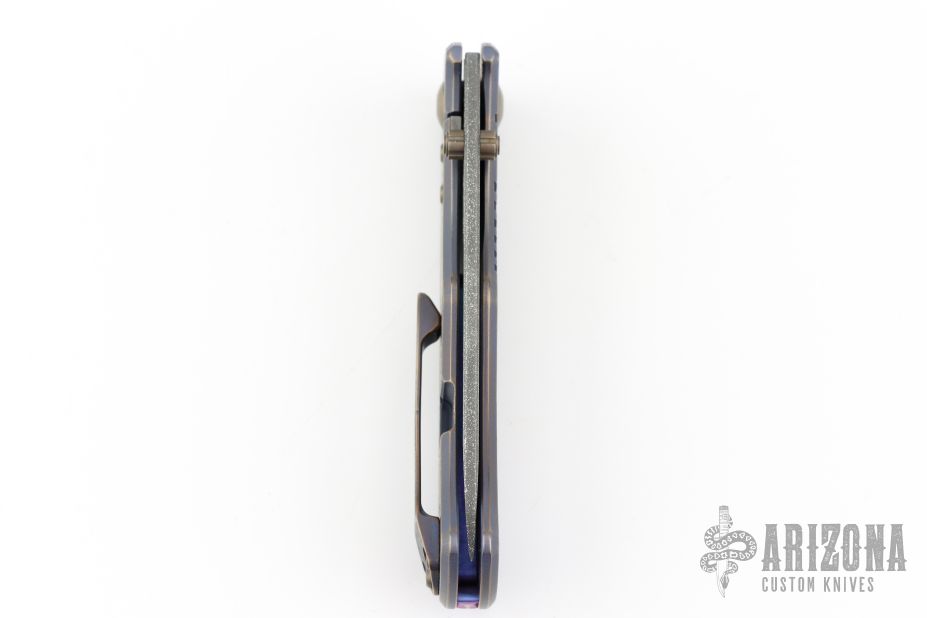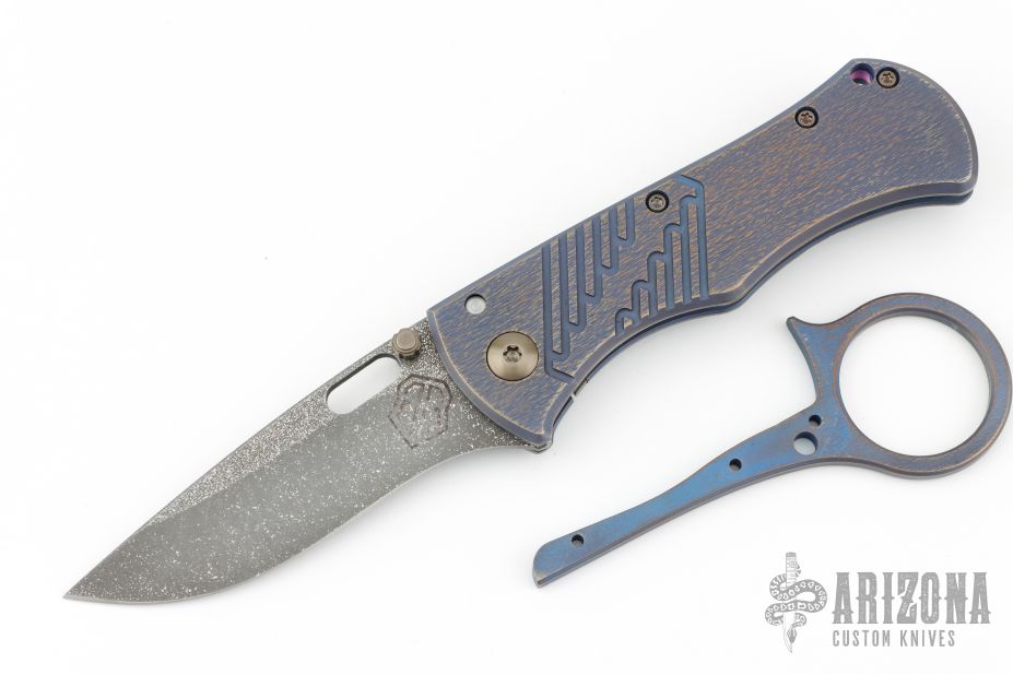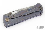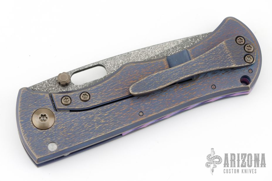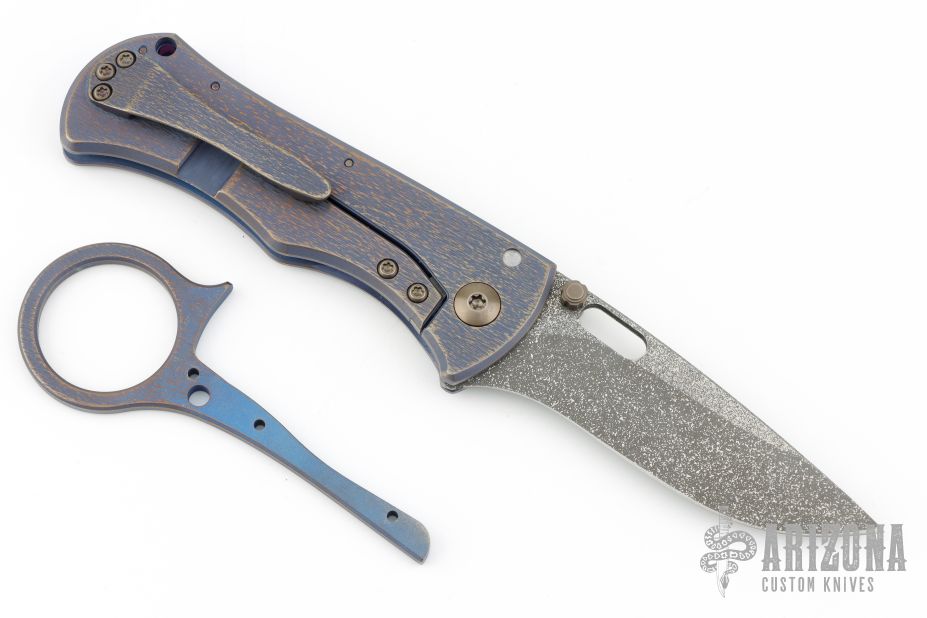 This Rostrum by John Gray features a dark tumble finished Magnacut blade with thumbstuds and thumbhole. The handle has a bark finished and anodized titanium frame with a textured and anodized titanium backspacer and tip up titanium clip. Has a stainless steel lockface insert and overtravel stop. Nice detent, lockup and blade seating. Comes with a ringed backspacer as well. Excellent condition. Comes with a zippered case.