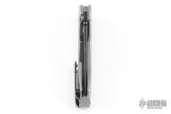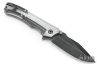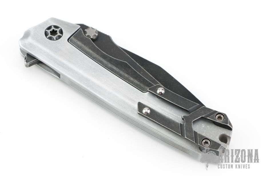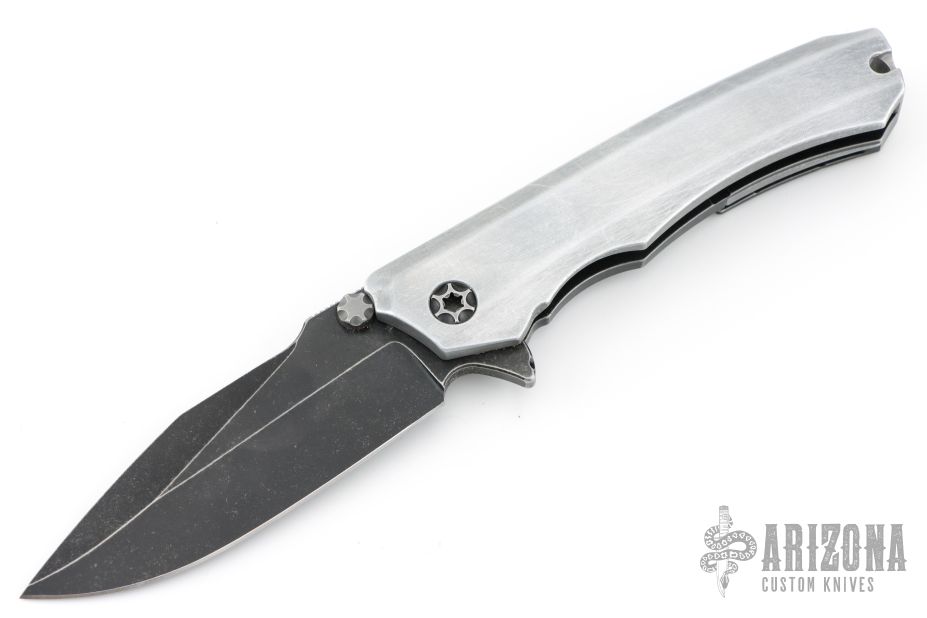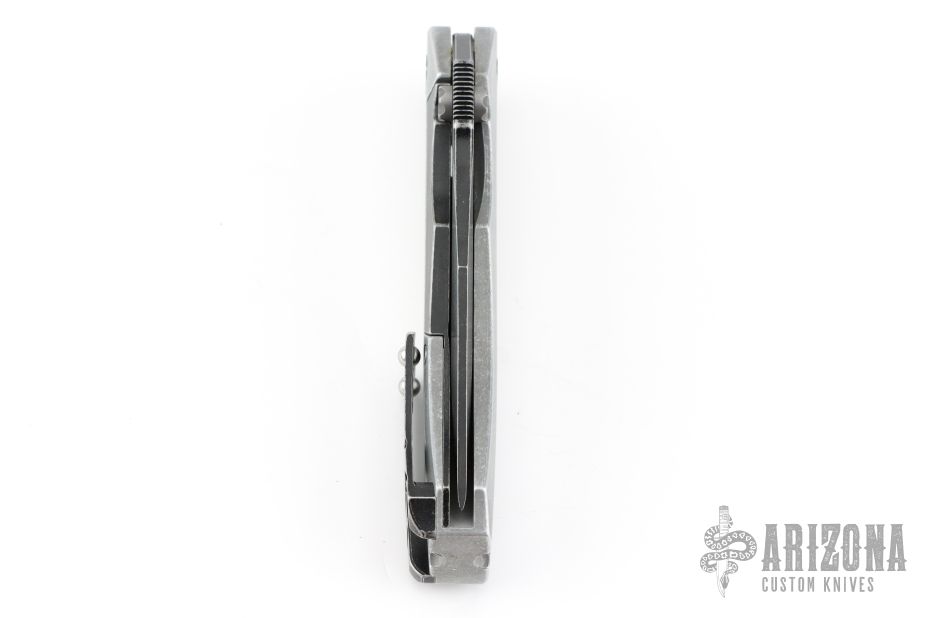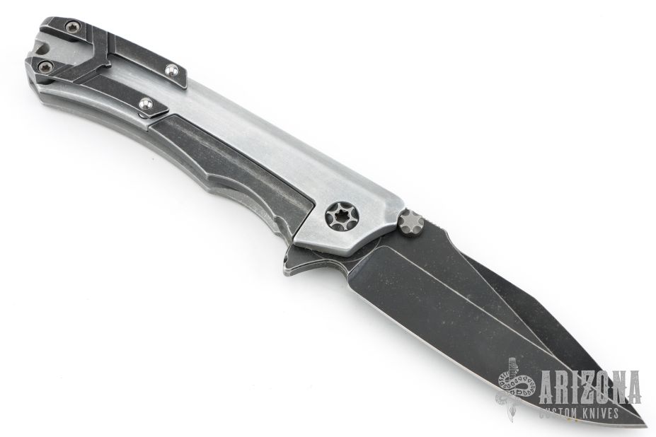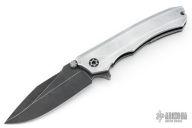 This Wraith by Heretic Knives features a black blizzard-worn blade, notched thumbrest and flipper. The handle has a battle-worn aluminum frame with black battle-worn stainless steel lockbar and tip up clip with ball bearing insets. Distressed finish. Excellent condition. Comes with original box and papers.