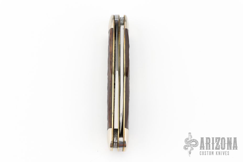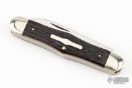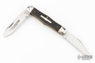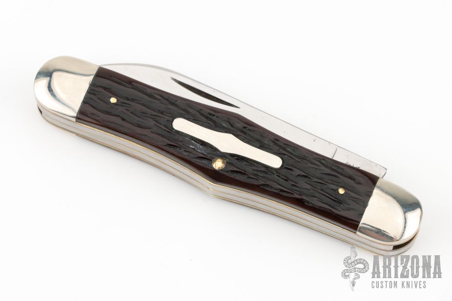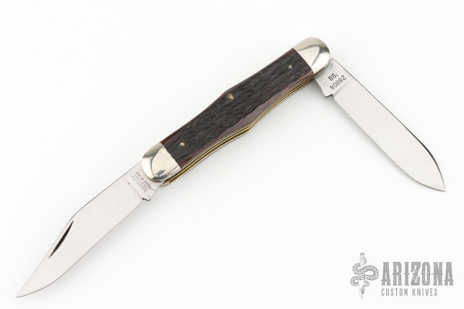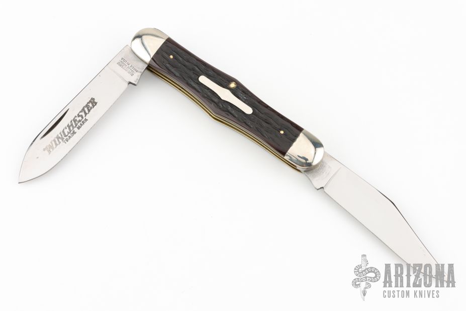 This Winchester Swell Center Moose slipjoint features two mirror polished blades with nail nicks. Nickel Silver front and rear bolsters with jigged bone covers. Brass liners and steel springs. Original box. Excellent condition.
