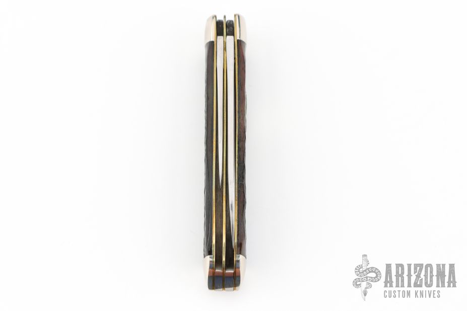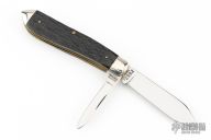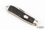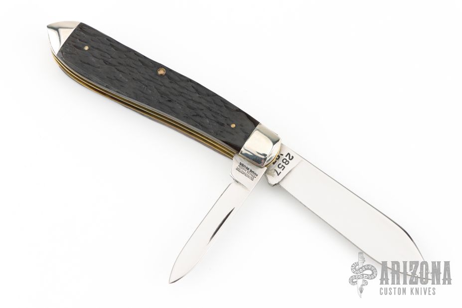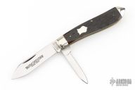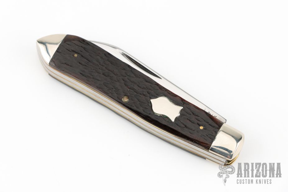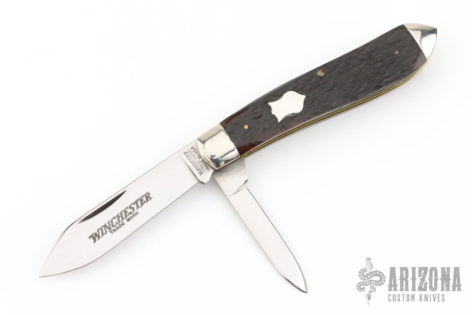 This Winchester Serpentine Jack features two mirror polished blades with nail nicks. Nickel Silver front and rear bolsters with Rogers dark brown jigged bone covers. Brass liners and steel spring. Original box. Excellent condition.