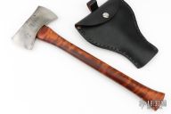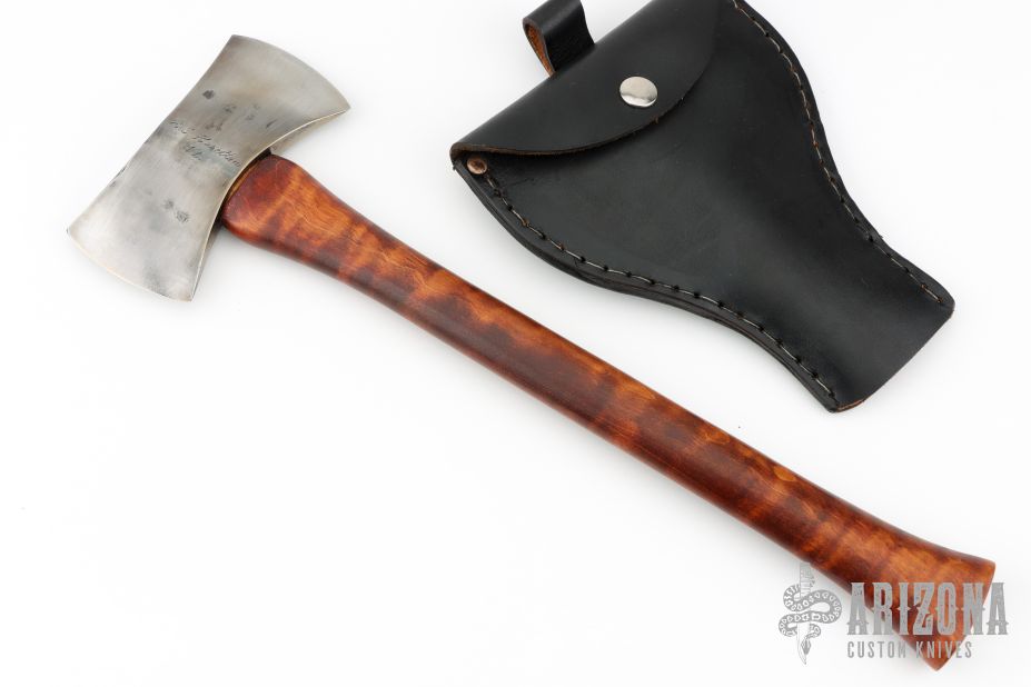 This Double Bit Axe with a curly maple handle. Head is hand forged by traditional blacksmith methods high carbon steel bits. Satin finished double edged blade. Edges are 2.25" long. Comes with leather sheath with belt loop. Has some scratches and patina, otherwse excellent  condition.