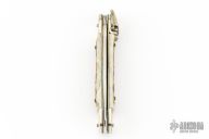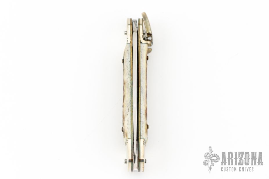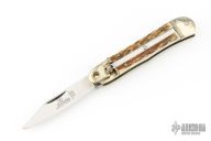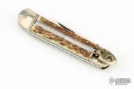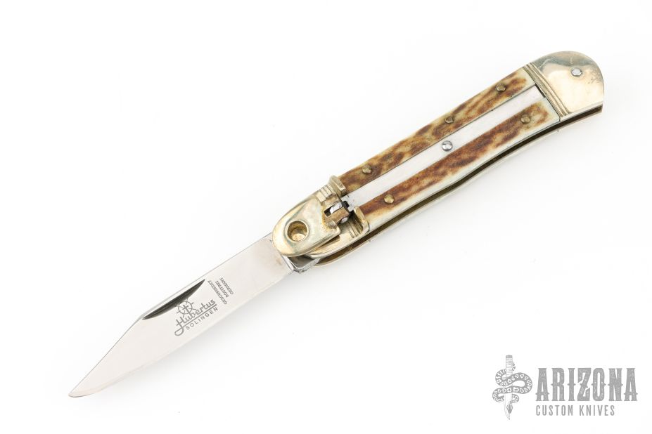 This leverlock auto by Hubertus features a mirror polished blade, nickel silver double bolsters, stag scales, nickel silver liners and brass pins. Opens with a nice snap. Very fast opening. Has some very light scuffs, scratches, and patina. Has been resharpened. Good condition otherwise.