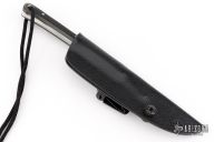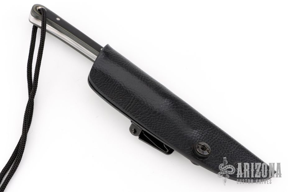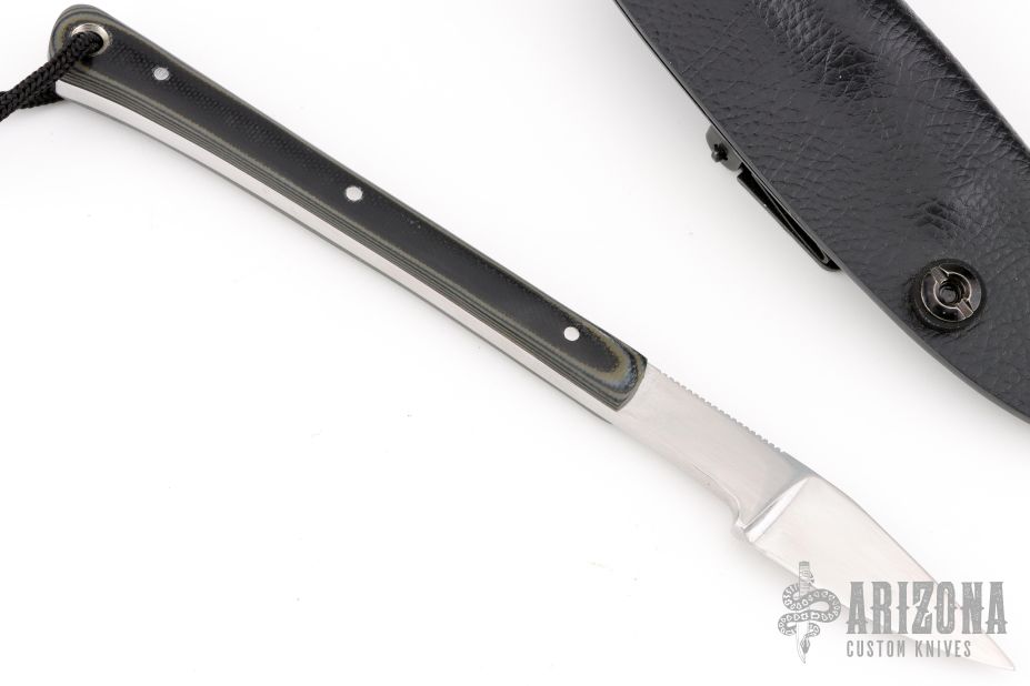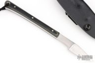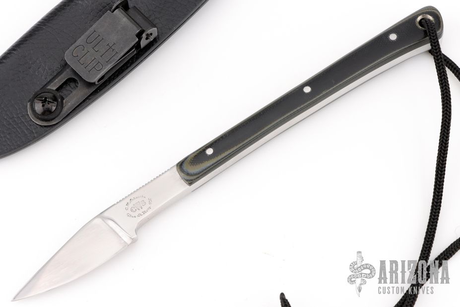 This Trout Knife by Chuck Schuette features a hand rub satin finished blade with notched thumbrest, .172" blade stock and .671" blade stock, full tang construction. The handle has black/green G-10 scales. Comes with a kydex sheath with Ulti-Clip. New from maker.