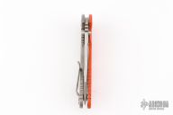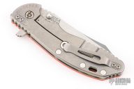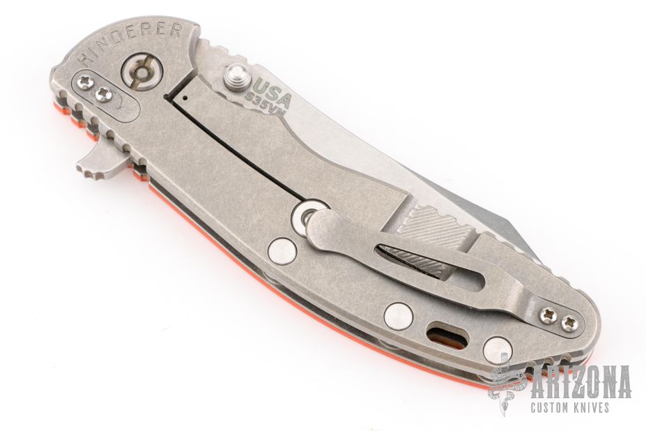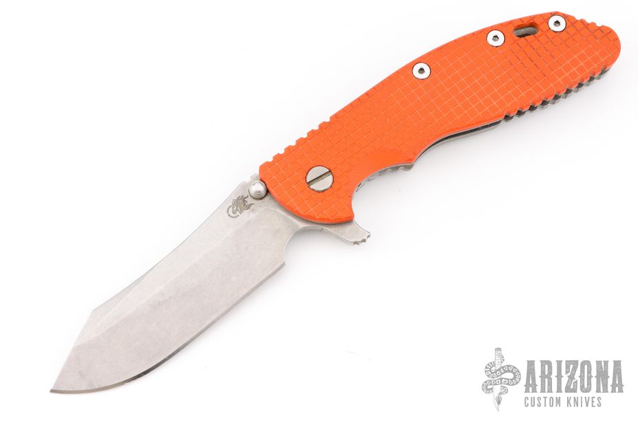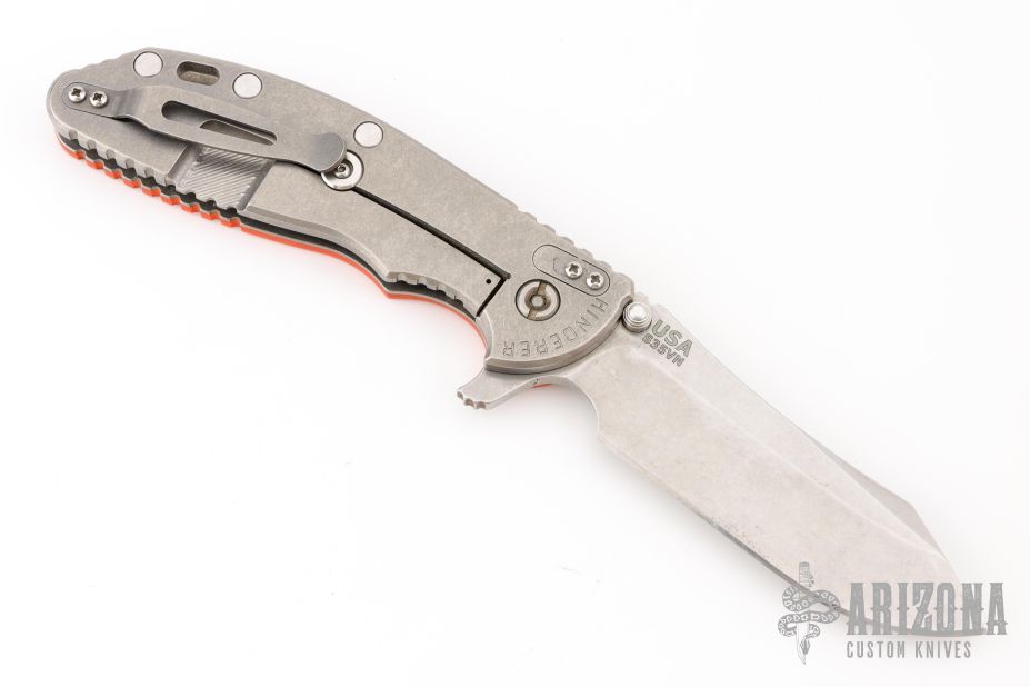 This XM-24 Skinner from Rick Hinderer Knives features a 4" stonewashed, Skinner ground blade and a textured G10 scale. Clip can be mounted for tip up or down carry. Blade is centered when closed, locks up with no play. This is the flipper model. Comes with original box, card, and FDE scale. Has some light scuffs, and scratches. Great condition otherwise.