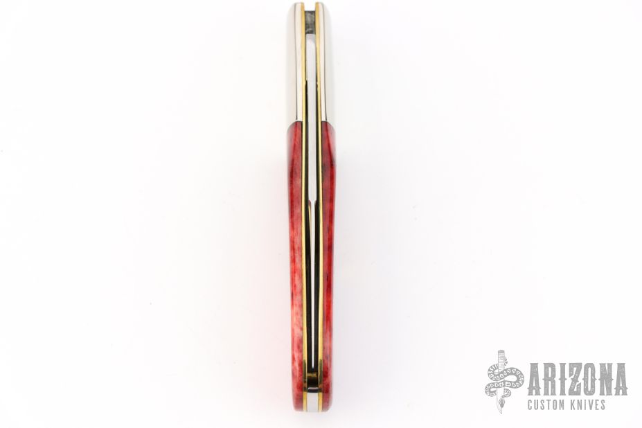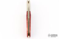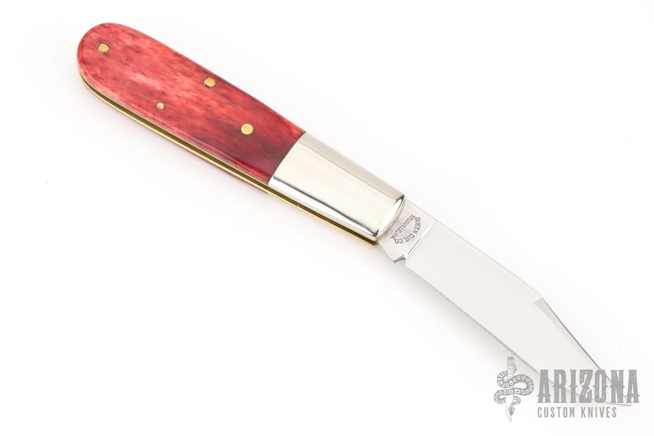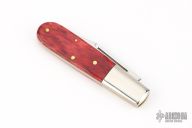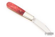 This slipjoint by Robeson Cutlery features a polished blade with long pull. The handle features nickel silver bolsters and red bone covers over brass liners and stainless steel spring. Includes original box. Excellent Condition.