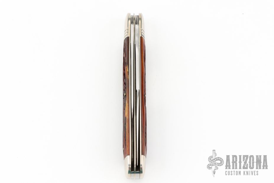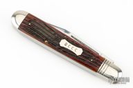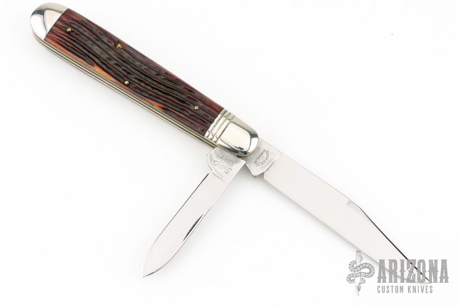 This slipjoint by queen cutlery co features two mirror finished blades with nail nicks. The handle features nickel silver bolsters, brass liners and jigged bone covers. Steel spring. Comes with original box. Excellent condition.