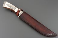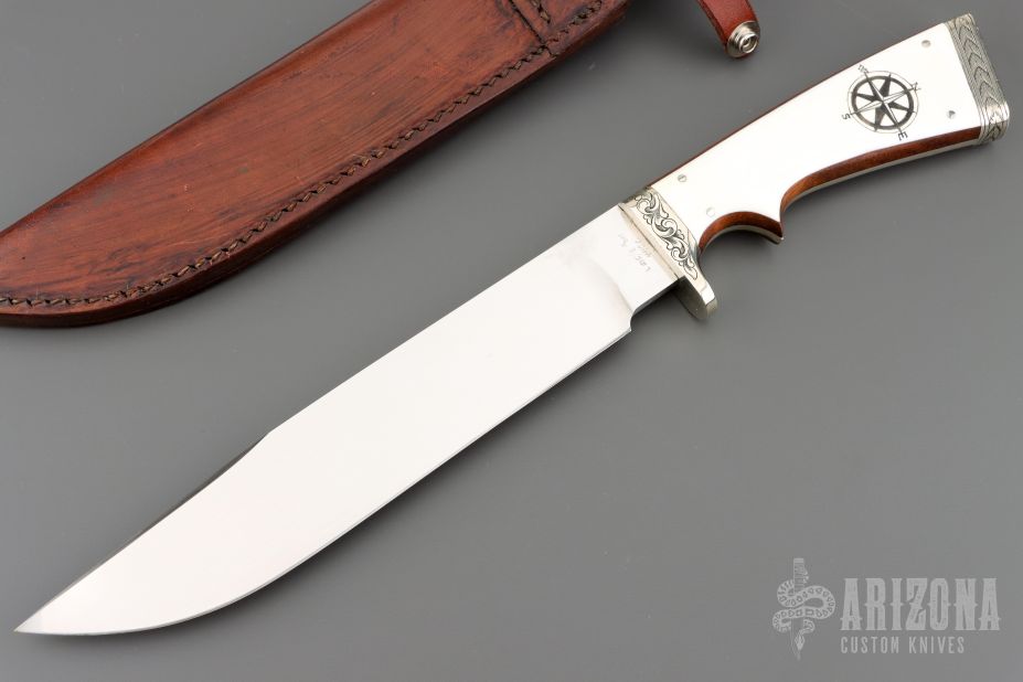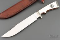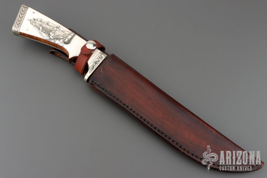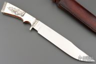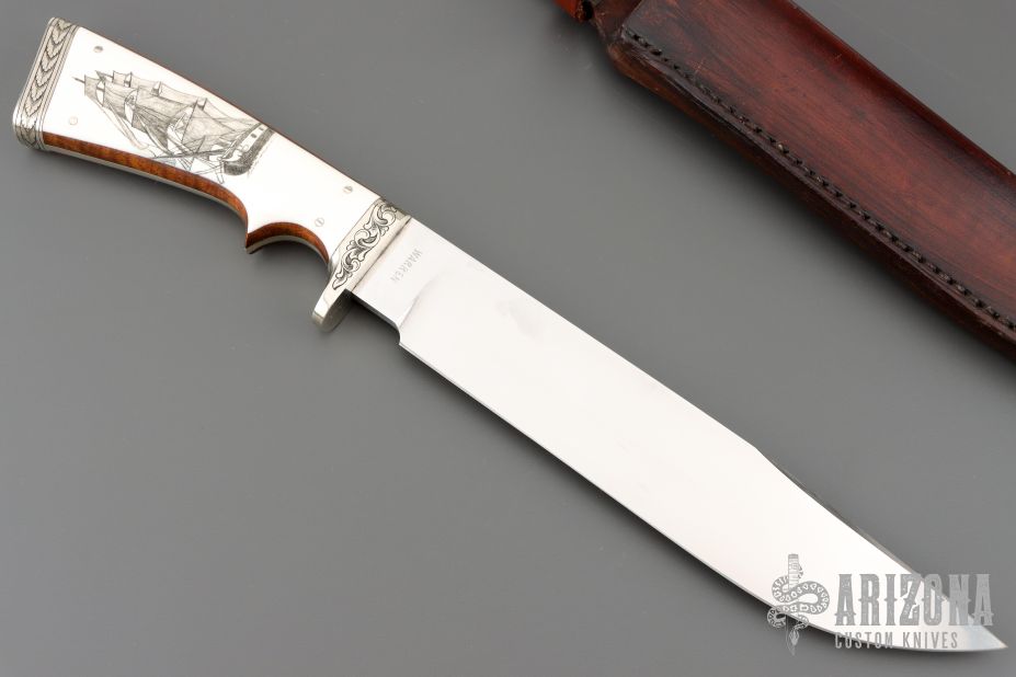 This Bowie by Al Warren features a hand rub satin finished blade with false top edge, .195" blade stock and 1.385" blade depth, hidden/frame tang construction. The handle has an engraved nickel silver guard and butt, nickel silver frame with mammoth ivory scales over walnut liners. The scales have been scrimshawed. Comes with a brown leather sheath. "L 215/8 #001 440C" on the blade. Has a couple very light scratches, otherwise excellent condition. This is #001
