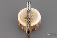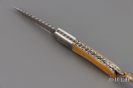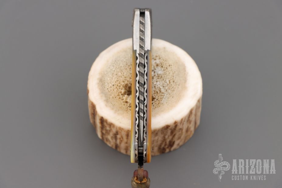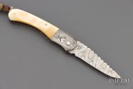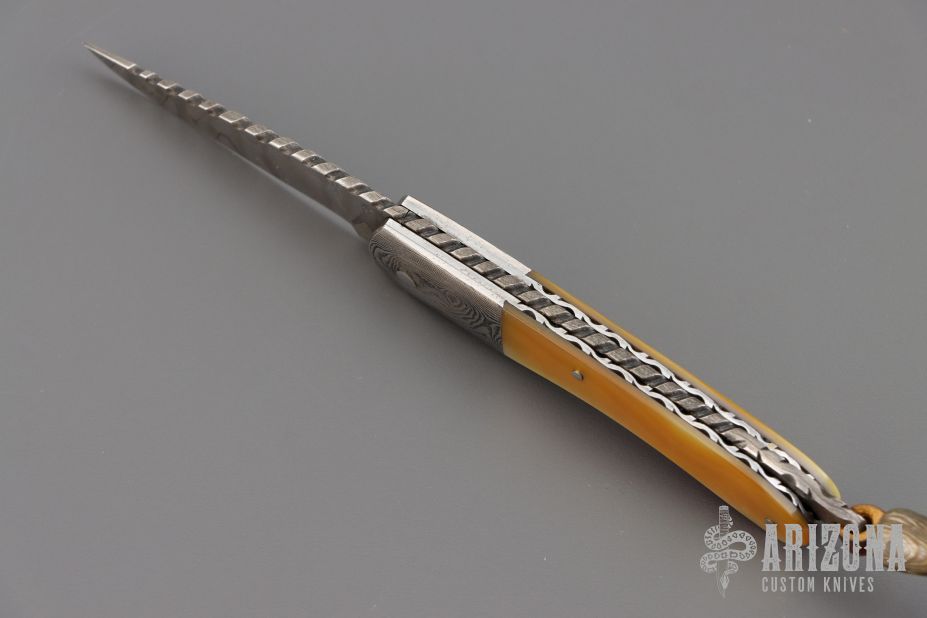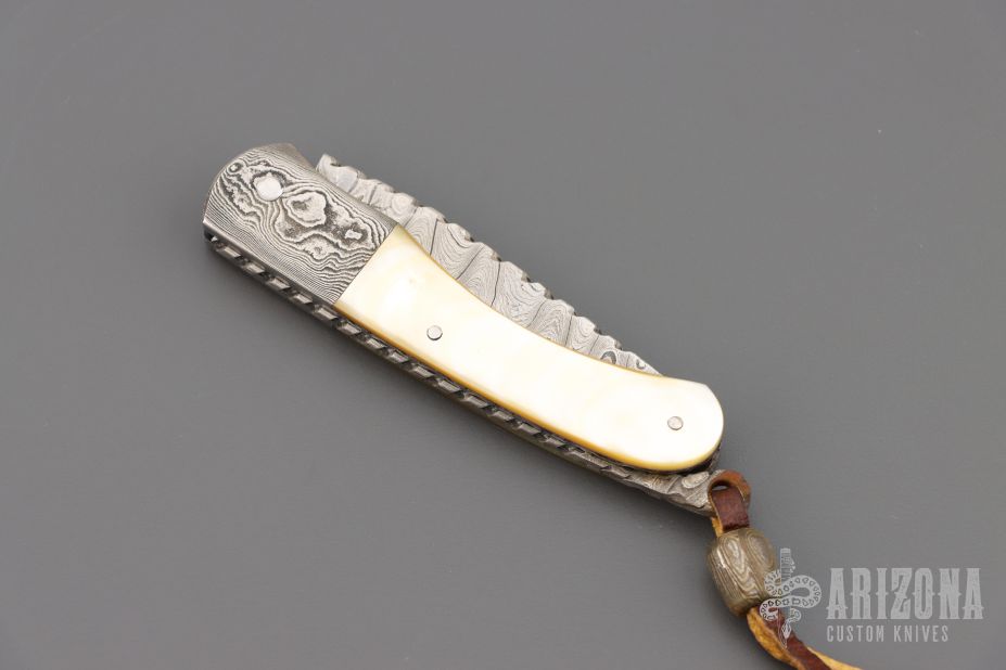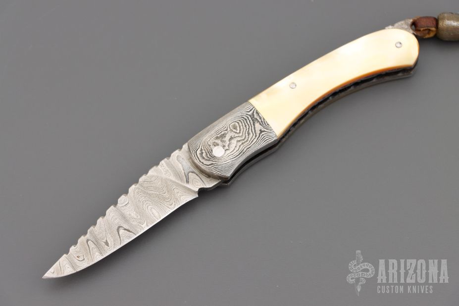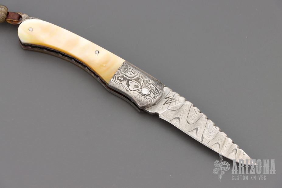 This lockback from Wayne Valachovic features a clip point high density ladder pattern Damascus blade with fileworked spine. The handle is comprised of dovetailed Damascus bolsters, gold lip pearl covers over file worked stainless steel liners and file worked Damascus backspacer. Leather lanyard with Damascus bead on pommel. Comes with original purchase receipt. Has some light rust on the tail and some patina on the blade/bolster. Great condition otherwise.