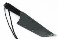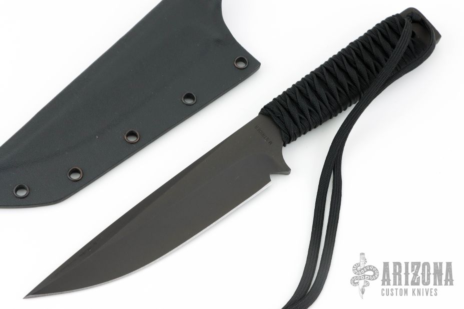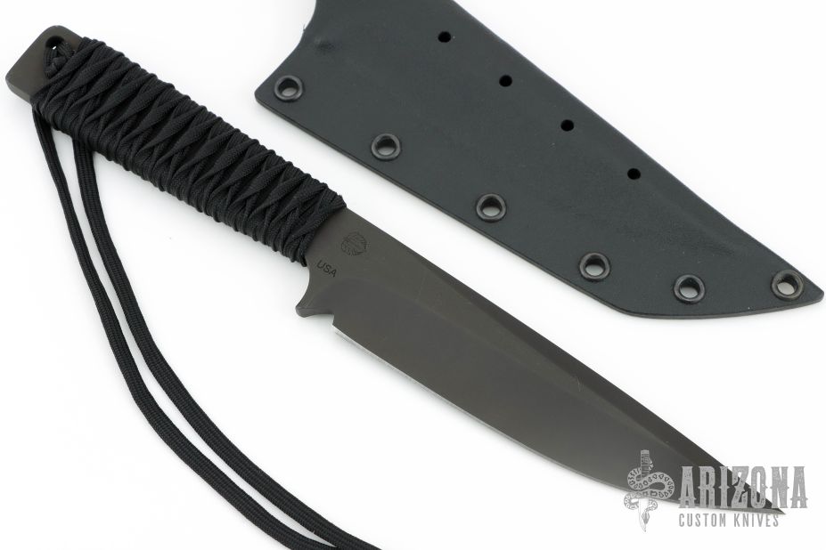 This WP Spear Point by Mick Strider features a black blade with false top edge, .251" blade stock and 1.365" blade depth, full tang construction with flat paracord wrap. Comes with a kydex sheath. Excellent condition.