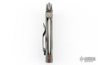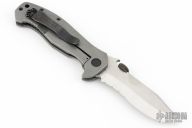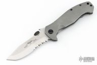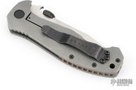This Po-Boy Mini CQC-15 features a stonewashed partially serrated blade with notched thumbrest, custom Rhodium plated Memento Mori thumbdisc (from Kahless Custom Metalworks - kahless756 on instagrame) and wave feature. The handle has a stonewashed titanium frame, black stainless steel tip up clip, geared flush copper backspacer. Smooth action with a nice detent, blade seating and lockup. Rides on ceramic bearings with hardened steel washers on the titanium side. Includes original box, papers, black G-10 scales and titanium liners (but the liners no longer have detent balls, so they are not usable), thumbdisc, pivot screw and washers, and black clip. Excellent condition.